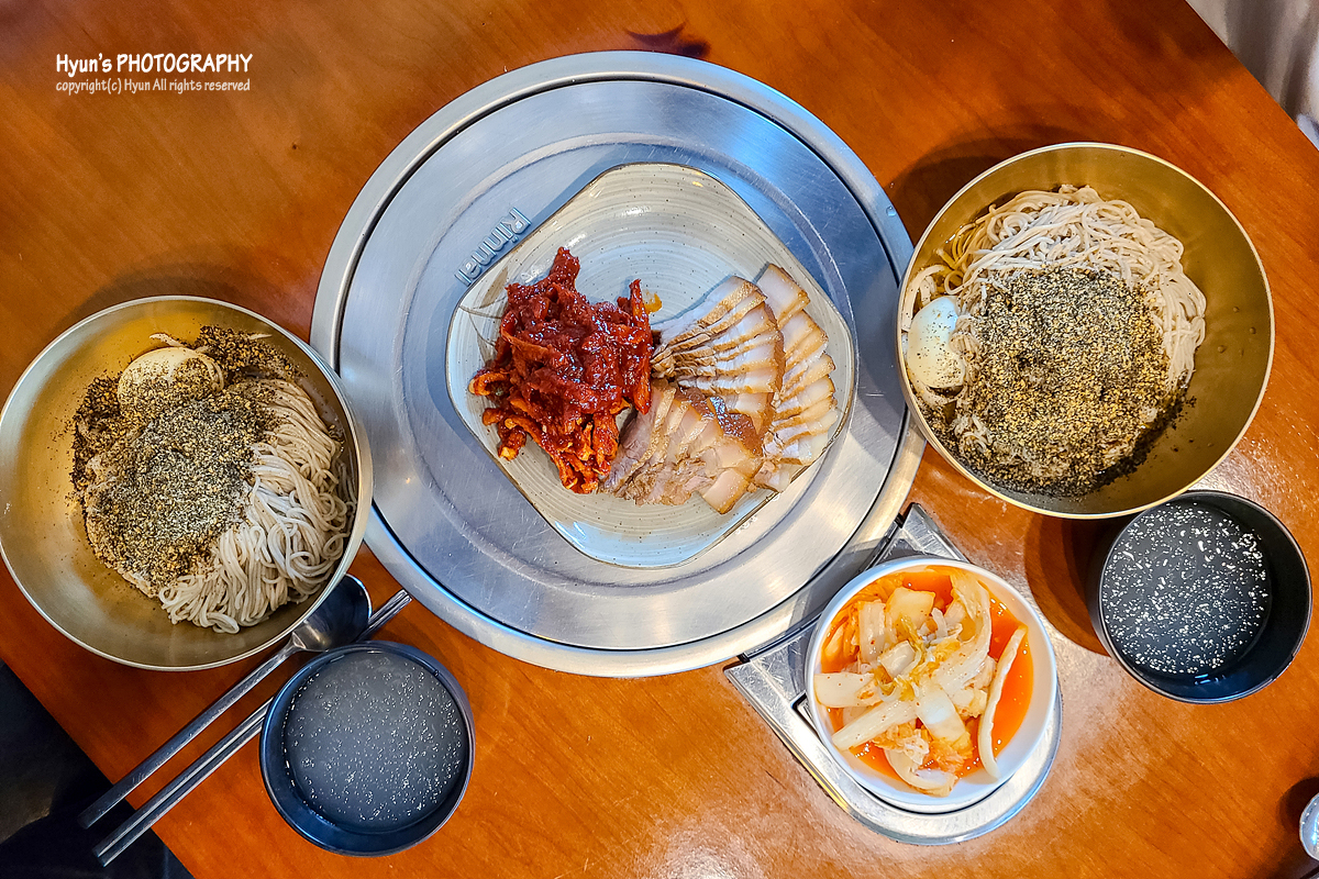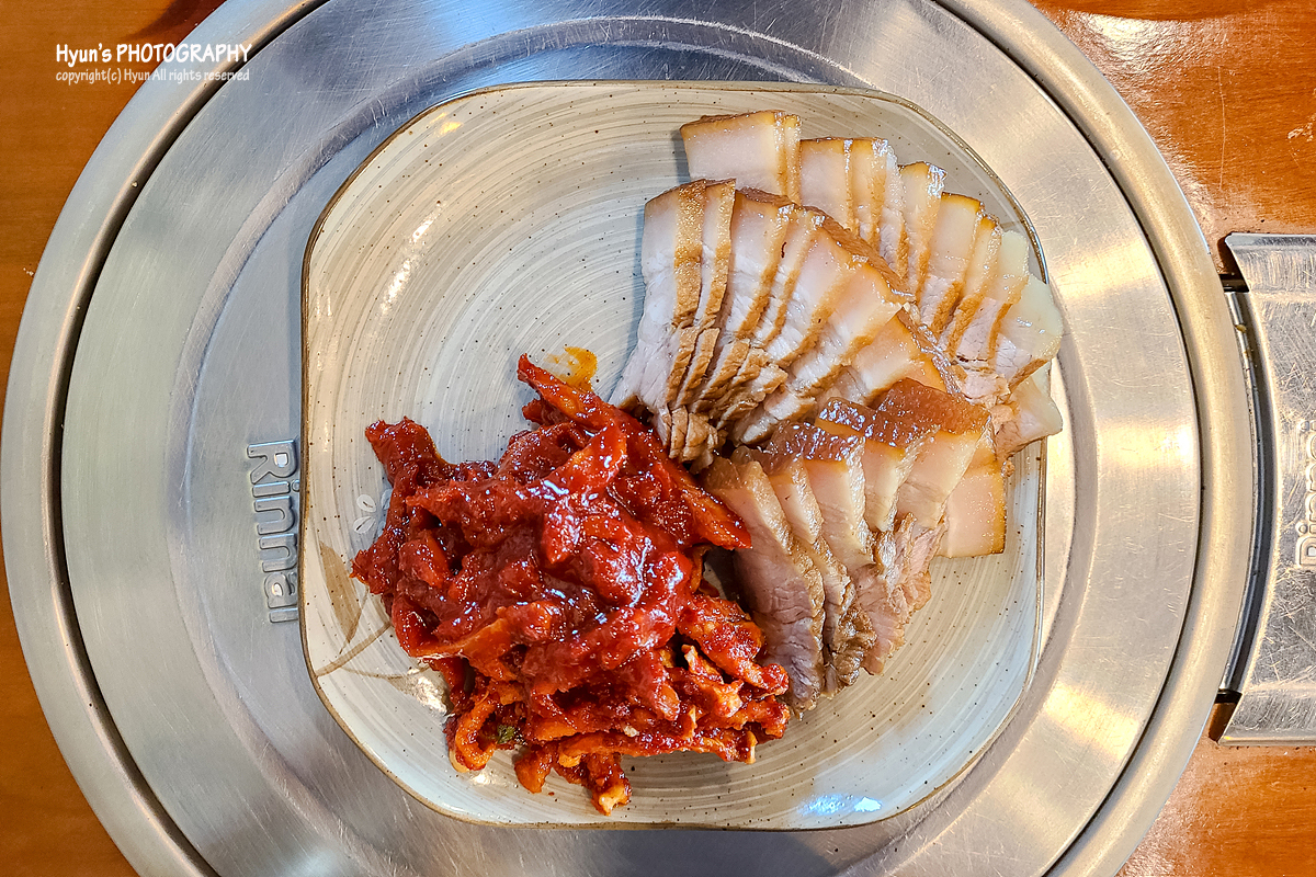 한창 허기가 질 때에는 막국수 하나만 먹기에는 좀 허전할 수도 있기 때문에 사이드 메뉴로 수육 한 접시도 같이 주문했습니다. 수육에는 명태회랑 보쌈무채가 같이 나오기도 해서 명태회 막국수를 간접적으로나마 맛볼 수 있기도 합니다. 들기름 막국수의 맛은 양념간이 약해서 마치 평양냉면 같은 슴슴한 맛기는 하지만, 고소한 풍미와 수육 및 명태회랑 같이 먹으면 꽤 잘 어울리는 맛이 나더군요.