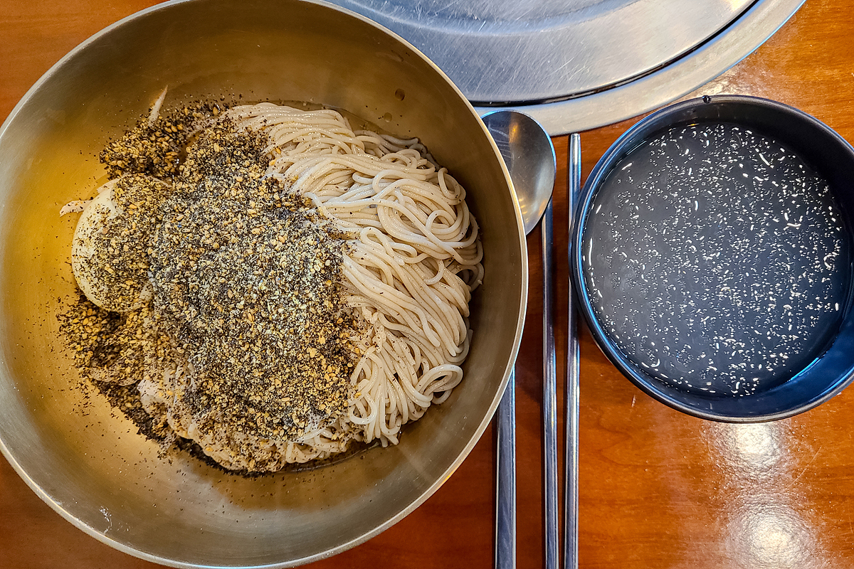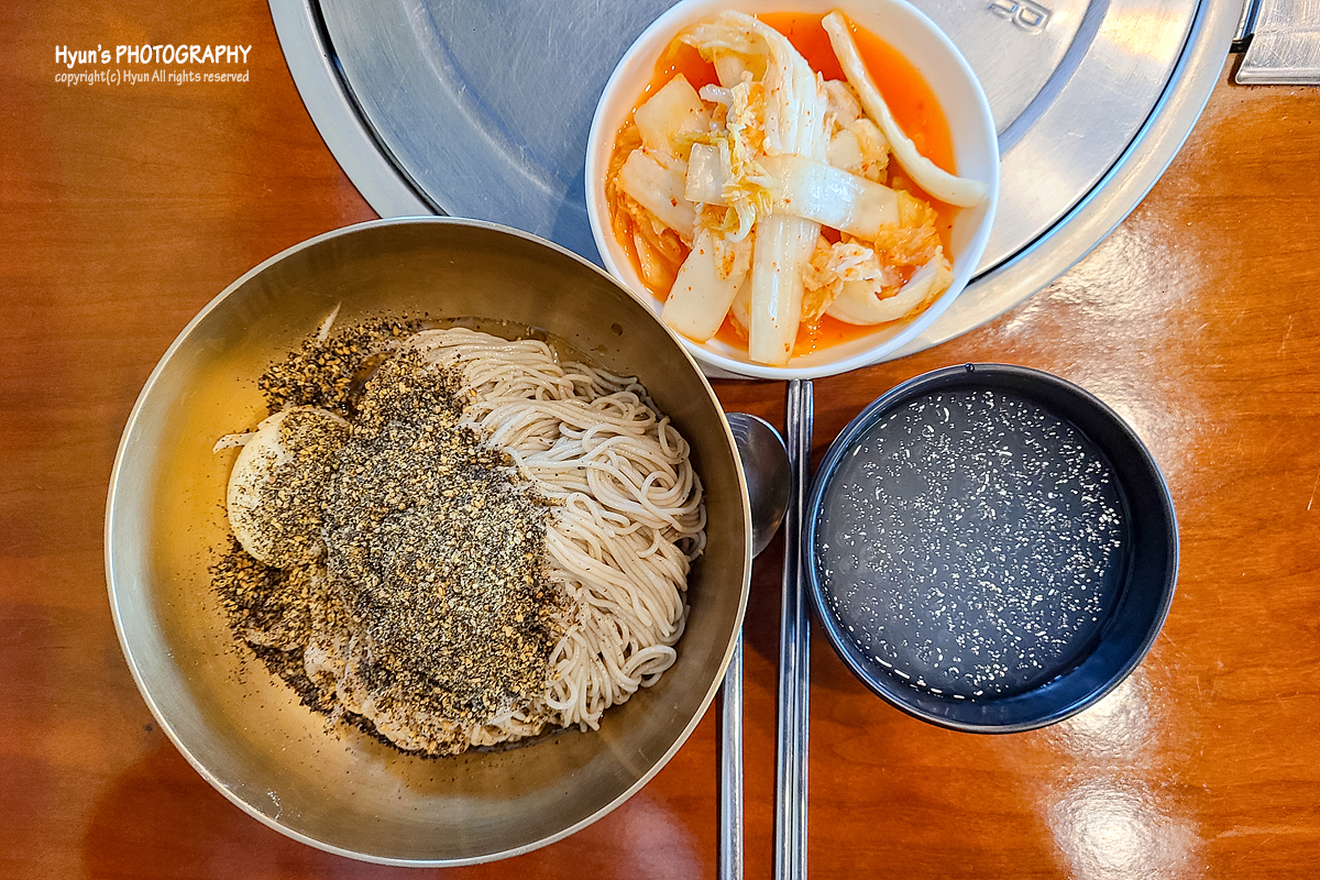 저는 들기름 막국수를 주문해서 먹었습니다. 100% 제주에서 생산되는 순메밀을 반죽해서 만들기에 꽤 자부심을 갖고 있는 식당이었어요. 오랜 기다림 끝에 나온 들기름 막국수인데, 보기만 해도 고소함이 풍겨 오는 것 같았습니다. 밑반찬은 김치가 함께 나오고 따로 작은 그릇에 동치미 국물이 나오기도 하는데, 동치미 국물은 막국수를 다 먹어갈 때 말아서 먹으면 맛있다고 합니다.