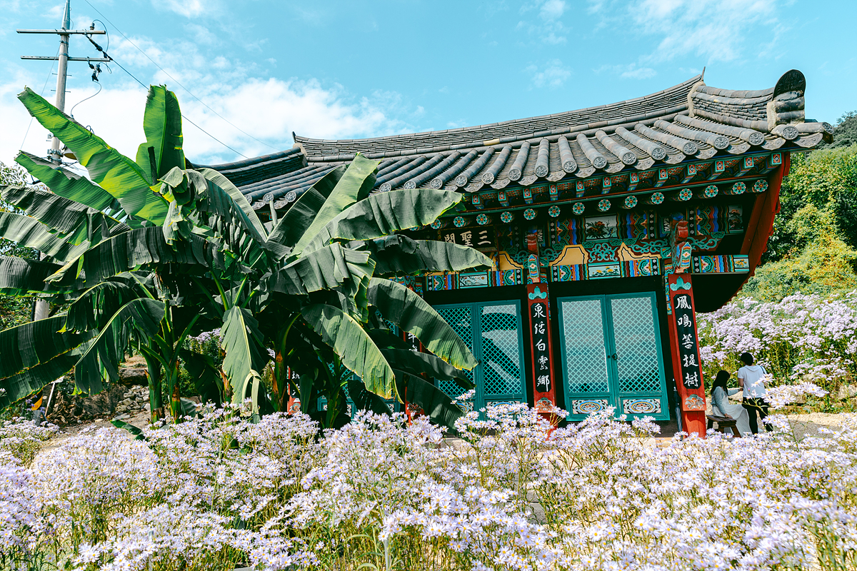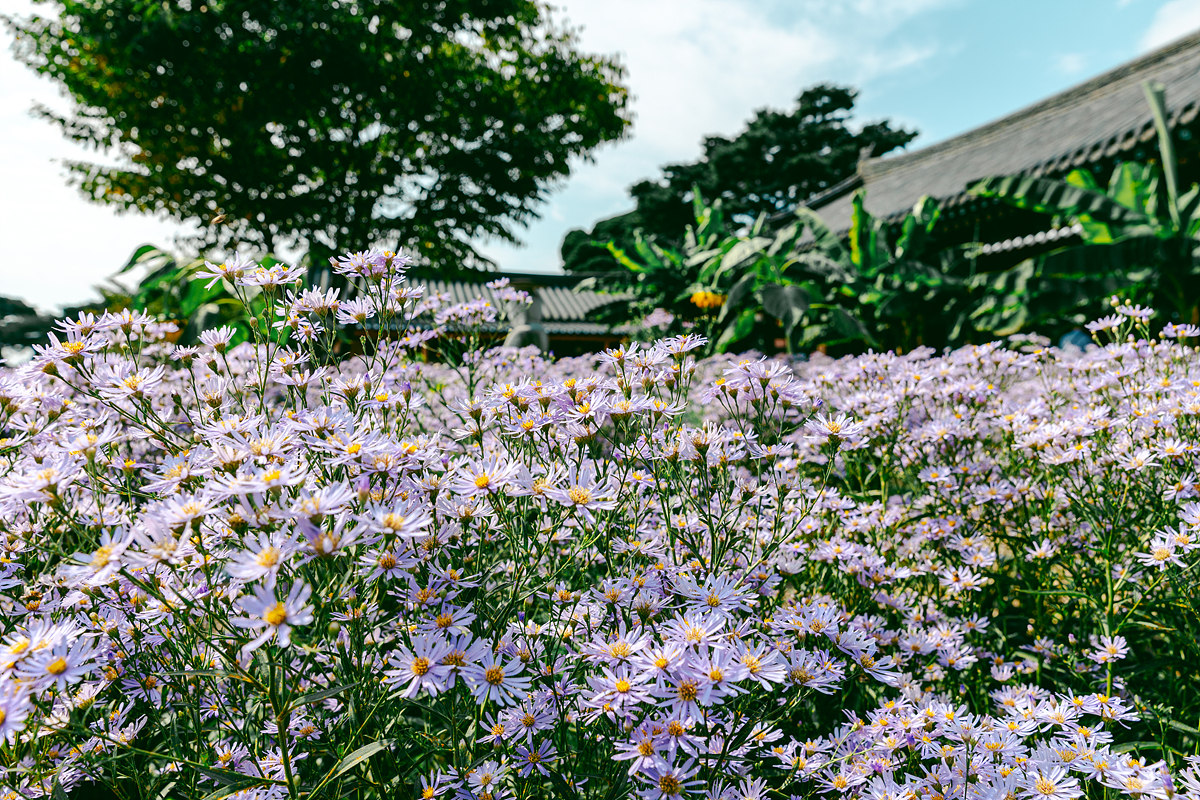 사찰 자체는 규모가 크진 않지만, 꽃이 절 주변을 가득 메우면서 이 시기만큼은 가을 여행지로 주목받고 있습니다. 봉천사 개미취는 원래 주지스님이 소량의 야생화를 심으면서 시작되었다고 합니다. 지금은 3천 평에 가까운 부지를 가득 채울 만큼 군락지가 형성되어, 초가을마다 보랏빛 물결이 이어지는데요. 대체로 9월 중순부터 피기 시작해 한 달 정도 지속되는데, 제가 다녀왔을 당시에는 약 80~90% 정도 개화해 가장 보기 좋은 시기입니다.
