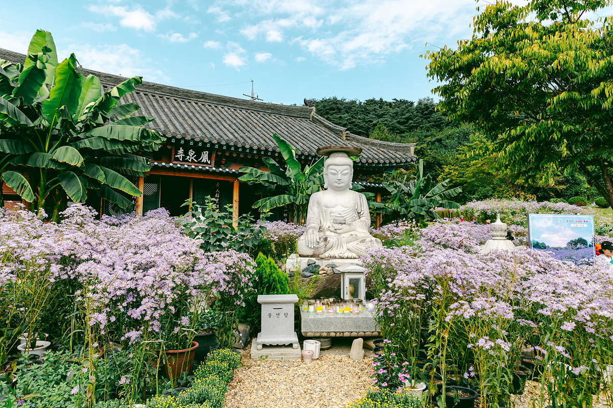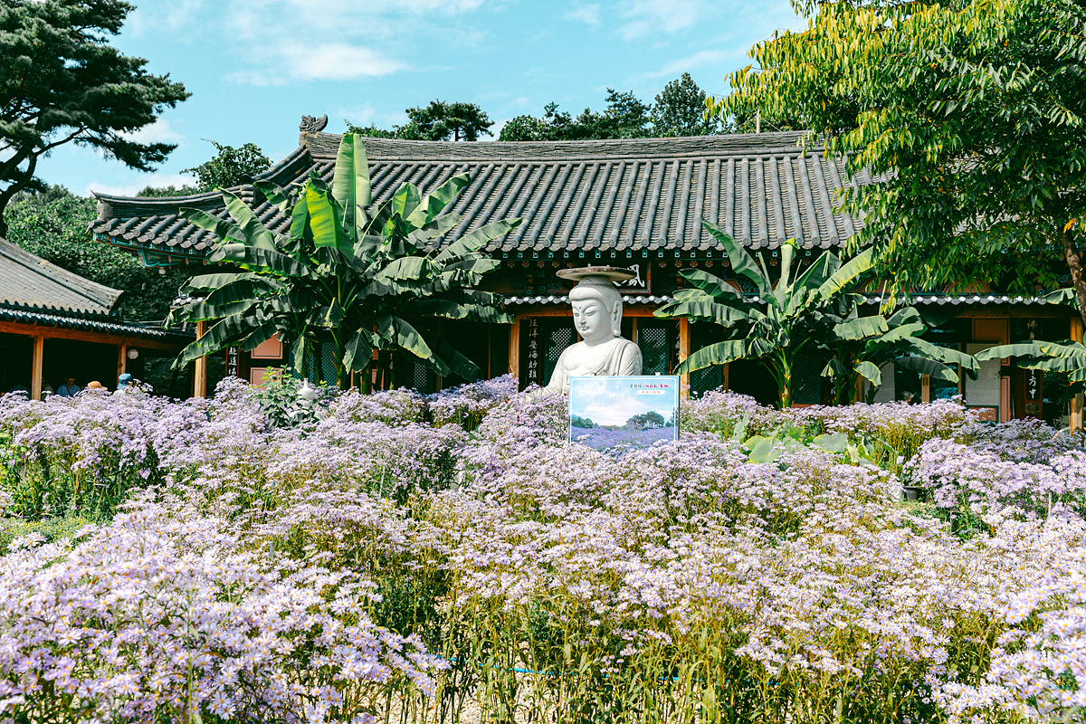 입장 후 가장 먼저 마주한 풍경은 법당 앞마당의 약사여래좌상과 석등이 개미취 꽃밭에 둘러싸인 모습이었는데, 이곳이 대표적인 포토존이라 사람들이 특히 많이 모여 있었습니다. 조금 더 안쪽으로 들어가면 훨씬 넓은 군락지가 펼쳐져 있어 천천히 산책하기 좋습니다.