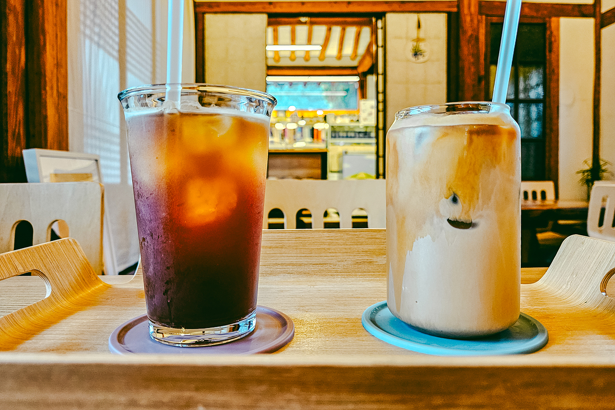 안쪽으로 들어서면 커피와 라떼, 다양한 음료 메뉴들이 준비되어 있는데, 가격대는 무난한 편이었고요. 저는 헤이즐넛 라떼를, 함께 간 친구는 아이스 아메리카노를 주문했습니다.