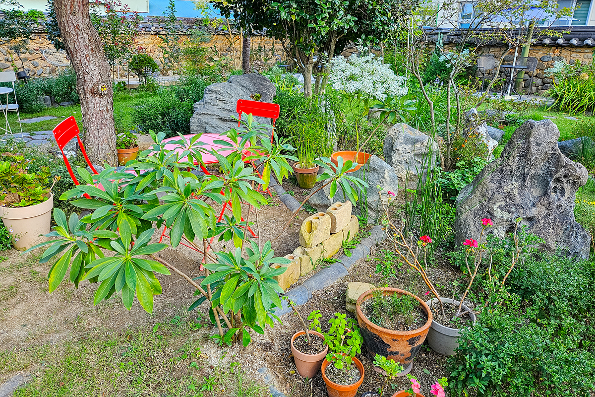 커피를 마신 후 마당을 한 바퀴 산책해보니, 테이블이 놓여 있어 야외에서도 여유롭게 커피를 즐길 수 있었습니다. 마당 한켠에는 사장님 부부가 손수 가꾼 작은 정원이 자리하고 있었고, 전체적인 외관 역시 한옥의 고유한 멋을 최대한 살려 카페와 책방으로 꾸민 점이 돋보였습니다. 덕분에 전통적인 운치와 차분한 분위기가 자연스레 느껴졌습니다.