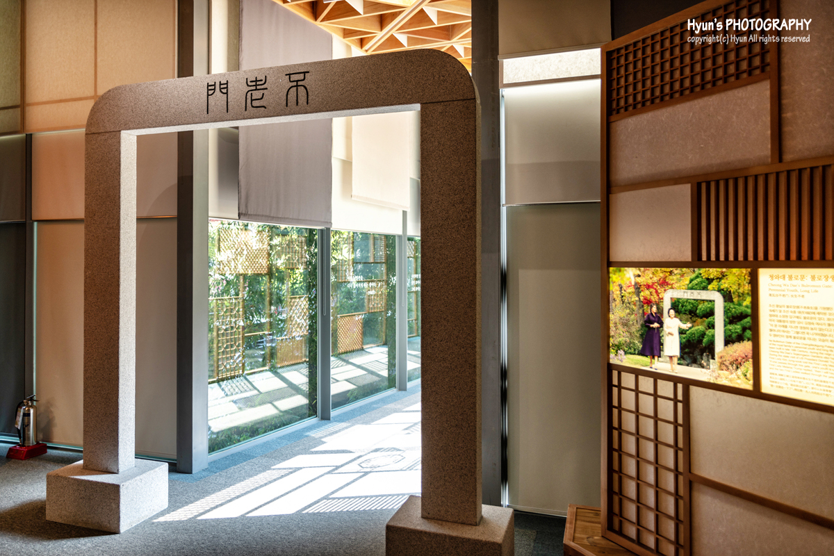 돌로 만들어진 불로문은 지난 2017년 트럼프 미국 대통령이 방한을 했을 때 영부인이었던 멜라니아 여사와 김정숙 여사가 함께 지났던 문을 사랑채 안에 그대로 재현해 놓은 모습입니다. 특히 느즈막한 오후시간 이 길을 지날 때에는 창문에 비치는 햇살을 통해 전통문양의 그림자가 매우 아름답게 보이기도 합니다.