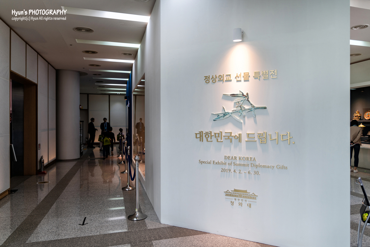 2층 청와대관에서는 매년 정해진 기간마다 기획전시가 열리고 있는데요. 4/2~6/30 까지는 '정상외교 선물 특별전, 대한민국에 드립니다.' 라는 주제로 대통령이 해외 순방 및 다른 나라 대통령이 청와대를 방문했을 시 정상들로부터 받았던 외교 선물들을 전시하고 있습니다. 지난해 남북정상회담이 열렸을 당시 북한 김정은 위원장으로부터 받은 진달래꽃 상감청자 반상기와 함께 중국 시진핑 국가주석으로부터 받은 바둑세트도 볼 수 있으며, 그 외에도 미국, 독일, 영국 등 그동안 정상회담을 했던 나라로부터 받은 외교선물들을 한 곳에서 볼 수 있답니다.