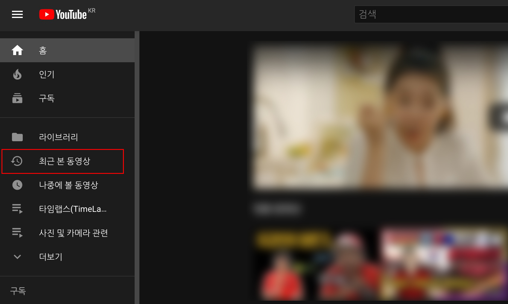 그래서 유튜브 검색기록이나 시청목록을 지우는 방법에 대해 알아볼까 합니다. 우선 유튜브 사이트에서 왼쪽 메뉴목록을 보시면 '최근 본 동영상' 메뉴가 보일겁니다. 선택을 해주고요.