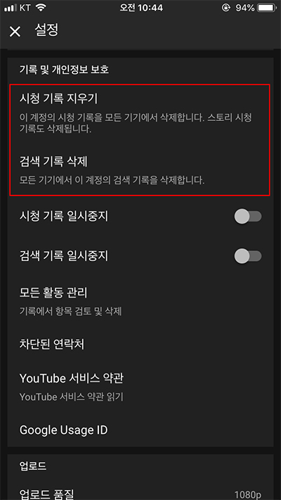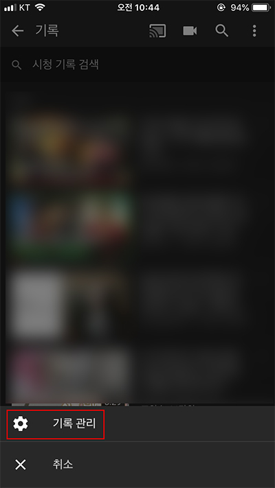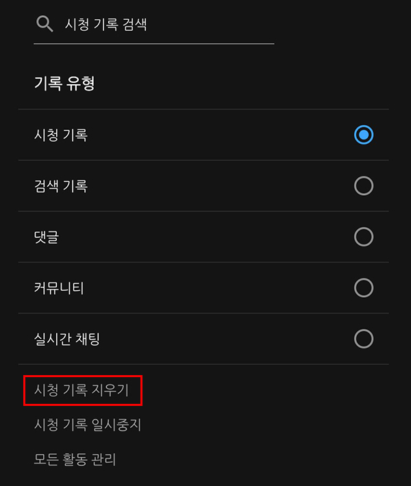 그런 다음, '기록 관리'라는 설정항목을 다시 선택해 주면, 마찬가지로 '시청 기록 지우기' 와 '검색 기록 삭제' 메뉴 항목이 보인 선택하고 삭제를 진행하면 됩니다.