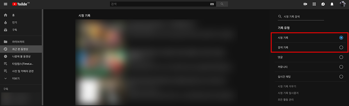 그럼 제일 오른쪽 부분에 시청기록 및 검색기록에 관한 목록을 살펴볼 수 있게 됩니다.