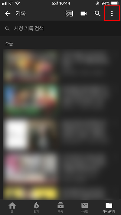 만약 스마트폰에서 직접 지우고 싶다면, 아래 항목 탭에서 '라이브러리' 메뉴를 선택하면 역시 '기록' 부분이 나올텐데요. 기록목록으로 들어간 후, 상단 오른쪽 설정 탭을 선택해 줍니다.