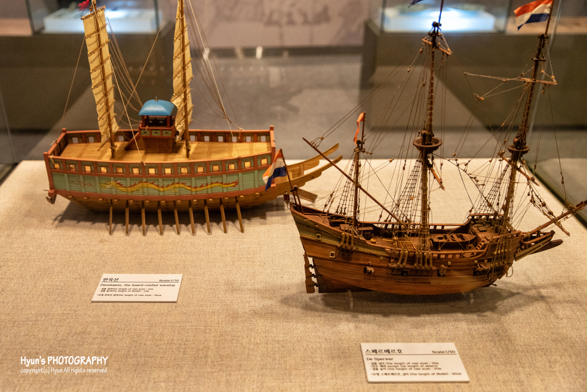 전시관 내부에는 하멜 일행이 조선에 표류하면서 남긴 기록물과 표류 이후의 일대기를 볼 수 있도록 구성되어 있구요. 또 한쪽에는 조선의 군선이었던 판옥선과 하멜 일행이 타고 표류했던 스페르베르호가 나란히 있는 모습을 볼 수 있습니다.
