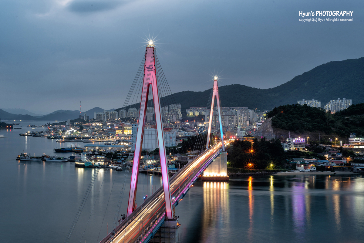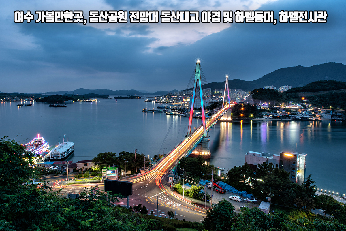 드디어 어둠이 내리고 돌산대교 주탑에도 조명이 환하게 들어오기 시작합니다. 역시 야경은 완전히 깜깜할 때 보다는 어느 정도 하늘빛이 남아있는 매직아워 시간대에 촬영하는 것이 가장 좋습니다. 왼쪽 선착장 부근에는 유람선이 출항을 하는 모습도 볼 수 있고요. 다음번엔 직접 유람선을 타며 여수밤바다의 야경을 즐겨보고 싶기도 하네요. 그래도 역시 돌산공원에서 내려다보는 돌산대교의 야경은 여수야경을 대표할 만큼 참 아름다운 풍경이었습니다.