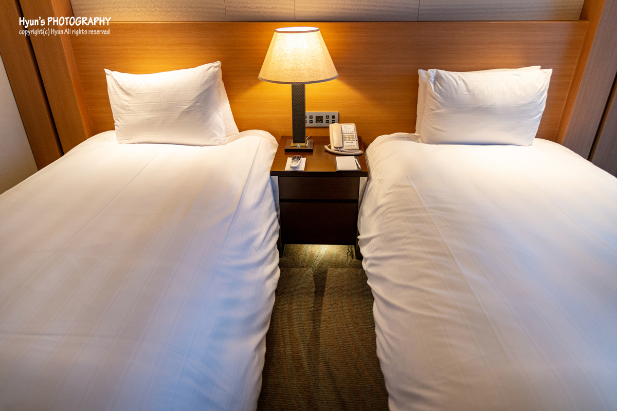 제가 묵었던 객실은 스탠다드 트윈룸이었는데요. 아늑한 싱글침대가 2개 놓여져 있으며, 시티호텔이라 그런지 방 크기는 생각보다 넓은 편은 아니었어요. 그래도 하룻밤 지내기에는 무난한 편이었으며, 침대 쿠션 역시 상당히 부드럽고 좋아 꿀잠을 자기엔 충분했습니다.