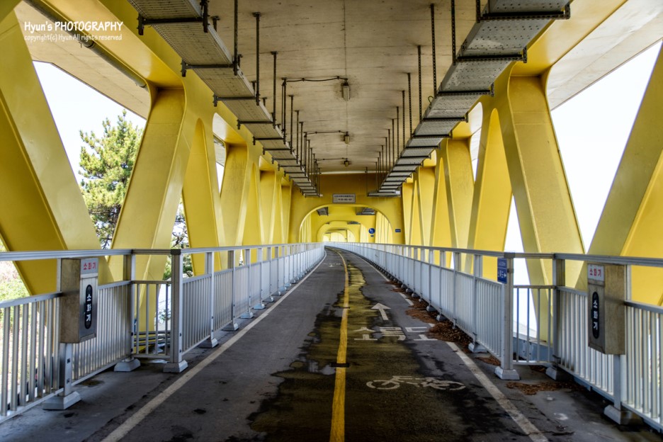 이곳이 바로 거금대교가 시작되는 입구 지점인데요. 아래쪽 자전거 도로의 모습입니다. 딱 자전거 두 대가 서로 교행할 수 있을 정도의 폭을 가진 도로인데요. 자전거를 타고 건너편 소록도까지 갈 수 있어요. 실제 거금휴게소 주변에는 자전거를 대여해 주는 곳도 있어 날씨가 좋을 때는 자전거를 타고 소록도를 다녀오는 것도 괜찮을 것 같습니다.