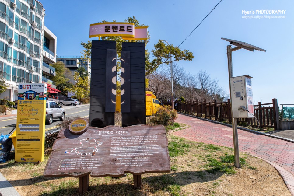 문탠로드는 달맞이길 입구 쪽에서부터 길이 시작되는데요. 입구 부근에는 해운대 앞바다를 시원하게 내려다 볼 수 있는 전망대가 있는 곳이기도 합니다. 해운대 해수욕장과 저멀리 동백섬 마린시티 풍경을 바로 볼 수 있는 곳이예요.