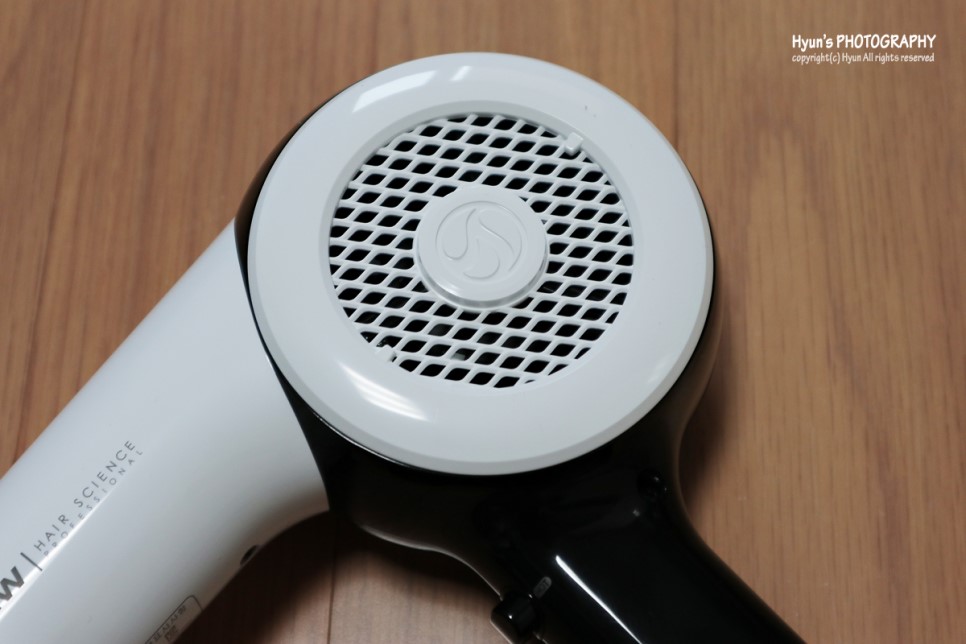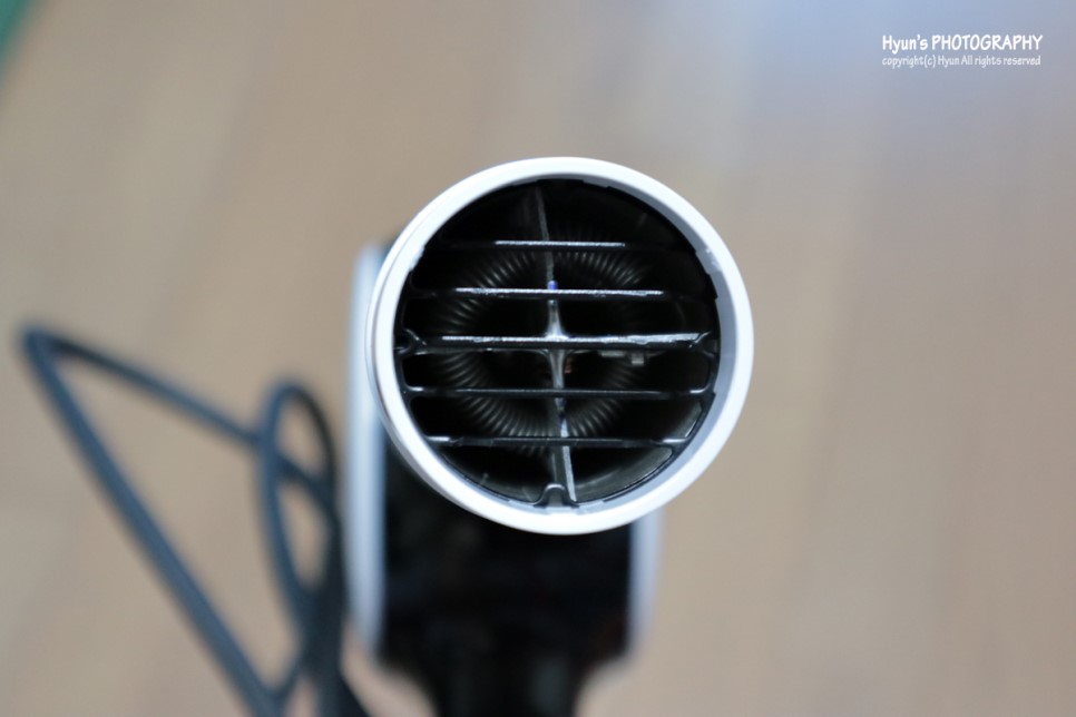 바람이 나오는 송풍구의 모습입니다. 송풍구의 크기가 생각보다 커서 노즐을 끼우지 않고 사용을 하게 되면 머릿결이 손상을 입을 수 있으니 왠만하면 노즐을 끼우고 사용하는 것을 추천 드립니다.