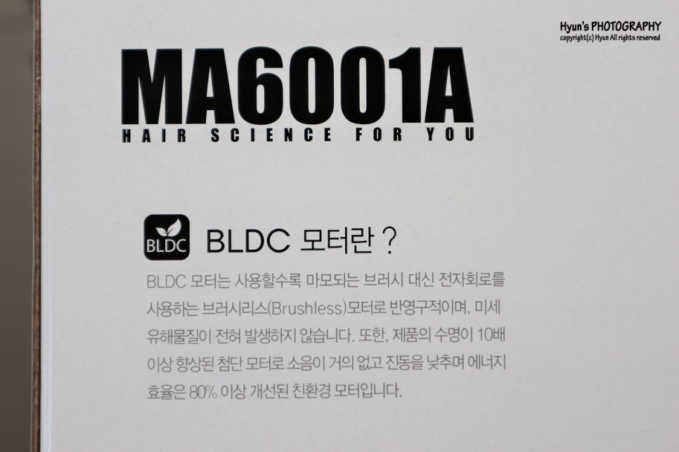 박스 외부에는 제품의 스펙이 간단하게 표기되어 있습니다. 무엇보다 가장 눈에 띄는 것이 바로 BLDC 모터라는 것인데요. 강력한 바람을 내어주는 모터라고 설명이 되어 있고, 바람이 세다 보니 머리를 말리는 시간도 줄여준다고 합니다.