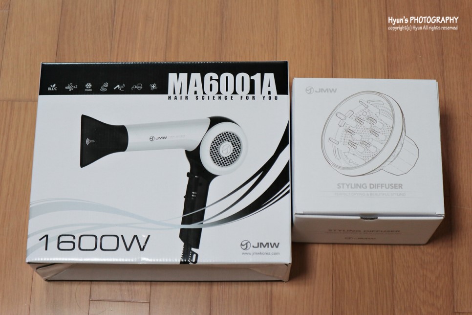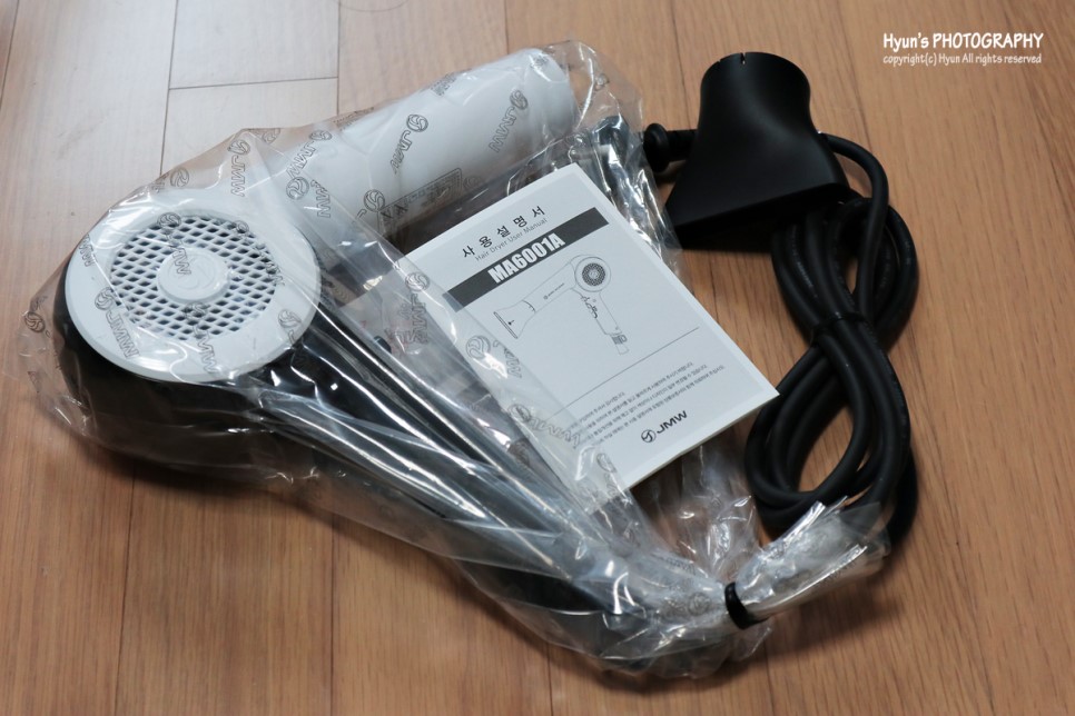 이번에 구입할 때는 미용실에서처럼 조금 좋은 걸 사용해보자 해서 역시 jmw 브랜드 제품으로 알아보던 중 MA6001A 라는 제품을 구입했습니다. 처음에는 디자인도 성능도 모두 괜찮은 다이슨 제품도 살짝 보기는 했었지만, 역시 가격이 너무 비싸 가성비로 사용하기 위해 jmw 제품을 선택했어요. 사은품으로 디퓨저까지 주더군요.