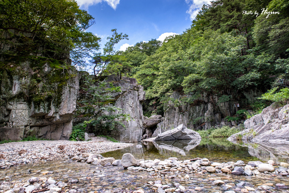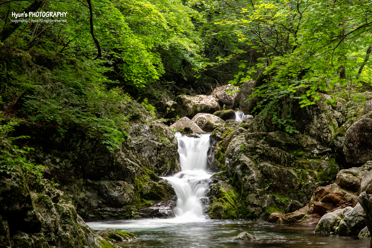 12개의 폭포 중 가장 유명한 폭포는 상생폭포와 관음폭포, 그리고 마지막에 있는 연산폭포 3곳의 폭포입니다. 가장 먼저 만나는 폭포는 상생폭포이며 바위 양갈래로 나뉘어 흘러내리는 모습이 인상적인 폭포이고요. 다시 한참을 걷다 보면 주변 동굴이 기묘한 풍경을 보여주고 있는 관음폭포가 나오게 되며, 관음폭포 위쪽의 구름다리를 지나면 시원하게 흘러내리는 마지막 연산폭포를 볼 수 있습니다.
