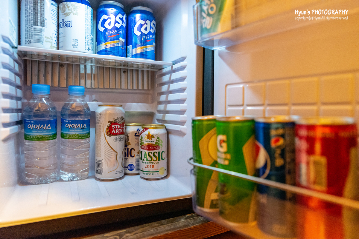 미니 냉장고도 마련되어 있고, 냉장고 안에는 각종 음료와 맥주가 채워져 있습니다. 다만 생수 말고는 모두 추후 계산이 되는 유료 음료들이니 저렴하게 음료나 맥주를 즐길 분들은 인근 편의점에서 직접 구입해 마시는 걸 추천합니다.