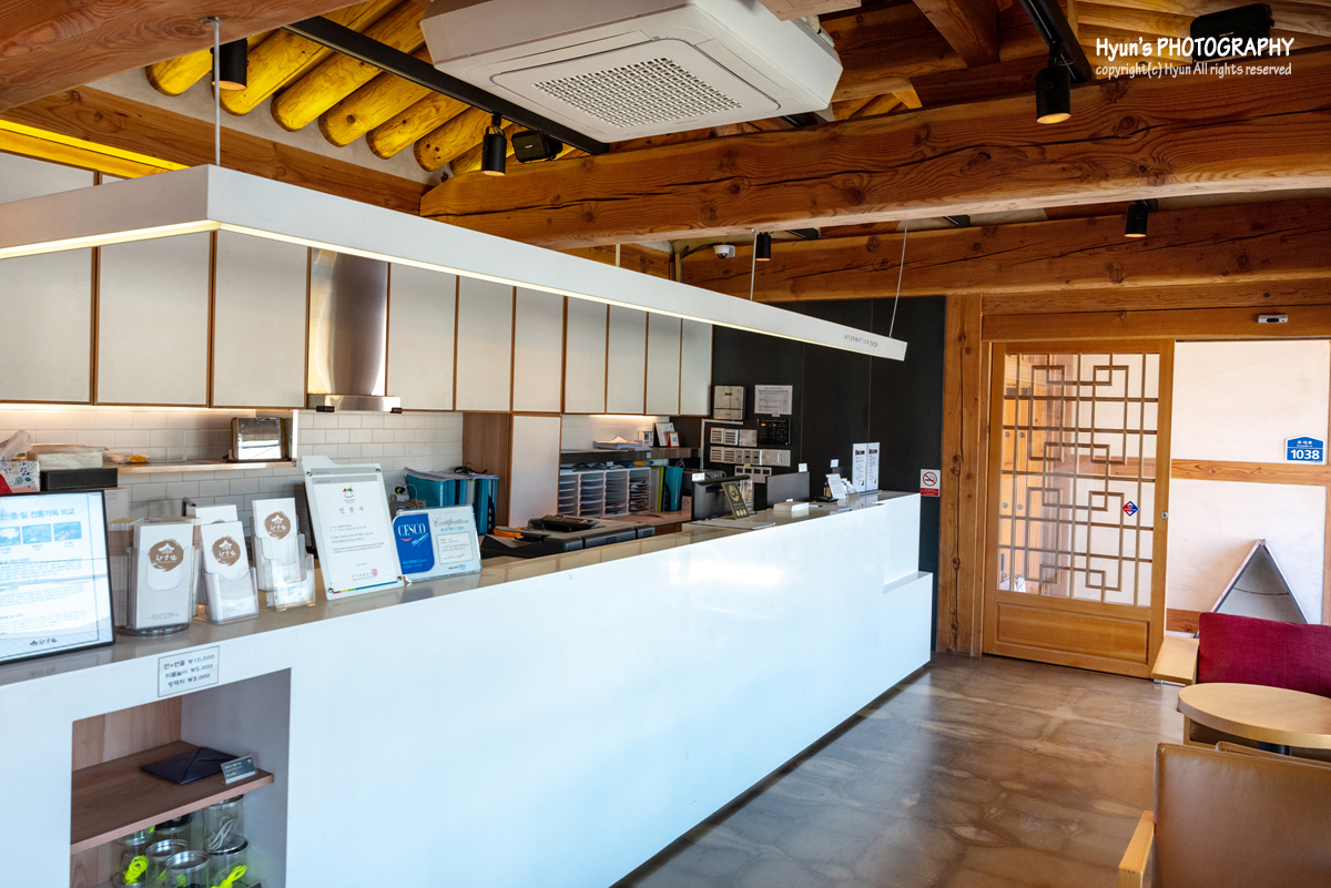 로비 내부로 들어서니 고즈넉하고 단아한 전통 한옥의 느낌을 물씬 풍기고 있었는데, 이곳은 체크인을 도와 주는 프론트 공간과 차를 마실 수 있는 휴게 공간으로 함께 구성되어 있습니다.