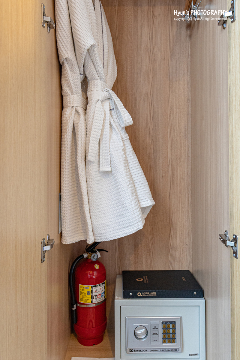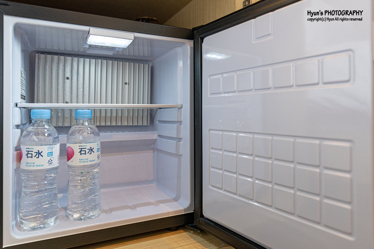 침대 한쪽 옆에는 옷장도 마련되어 있고, 안에는 욕실가운 2별과 소화기 및 귀중품 보관을 위한 개인금고도 준비되어 있습니다. 미니냉장고 안에는 아무 것도 없어 테이블 위에 있던 생수 2통을 냉장고 안에 넣어두고 마셨고요. 나중에 근처 편의점에서 맥주를 사다 넣고 마시기도 했습니다.