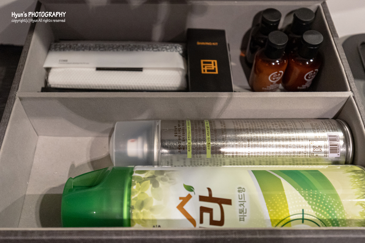 저는 사용을 하지 않았지만, 욕실 가운은 깔끔한 비닐에 포장이 되어 있었고, 커피포트와 믹스커피, 1회용 어메니티 같은 필요물품들은 객실 내에 비치가 되어 있습니다. 여름이라 그런지 에프킬라 모기약도 있더군요. 어차피 에어컨을 틀어놓아 문을 열 일이 없기에 모기는 없었습니다만, 그래도 없는 것 보단 있는 것이 나은 것 같습니다.