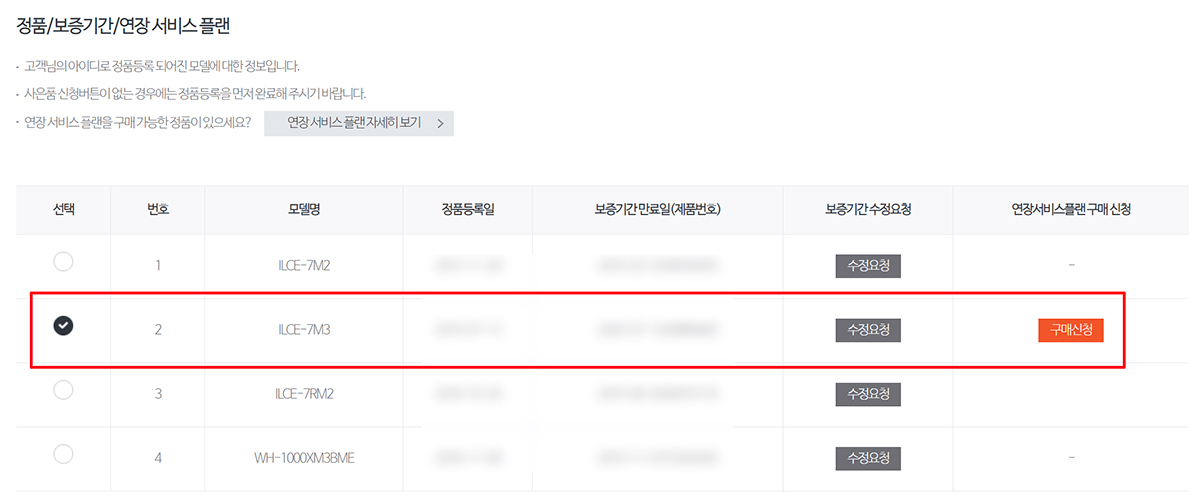 소니 홈페이지에서 가입을 하려면 우선 로그인을 한 뒤, 나의 정품등록 기기들을 살펴보면 정품 등록한 목록들이 쭉 나오게 되는데, 가입조건이 맞으면.. 즉 기존 AS 기간이 지나기 전이라면 오른쪽에 연장서비스플랜 '구매신청'이라는 버튼이 활성화가 됩니다. 저의 경우, A7m3 바디를 작년 7월 중순에 구입을 했는데, 올해 7월 보증기간이 만료되기 전 접속을 해보니 이렇게 구매신청 버튼이 활성화 되어 있더군요.