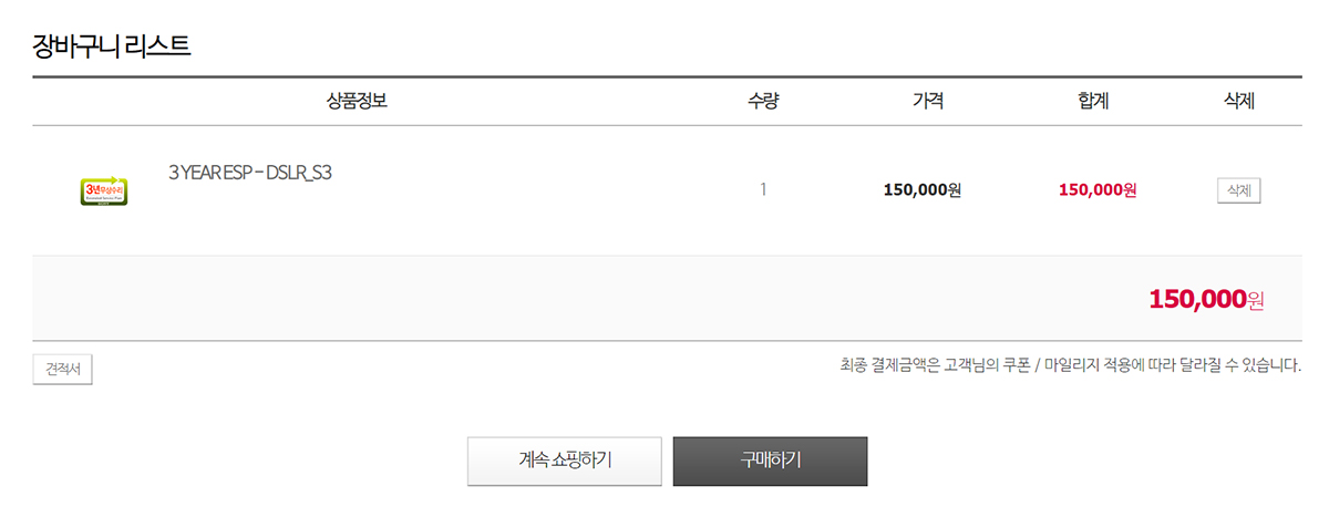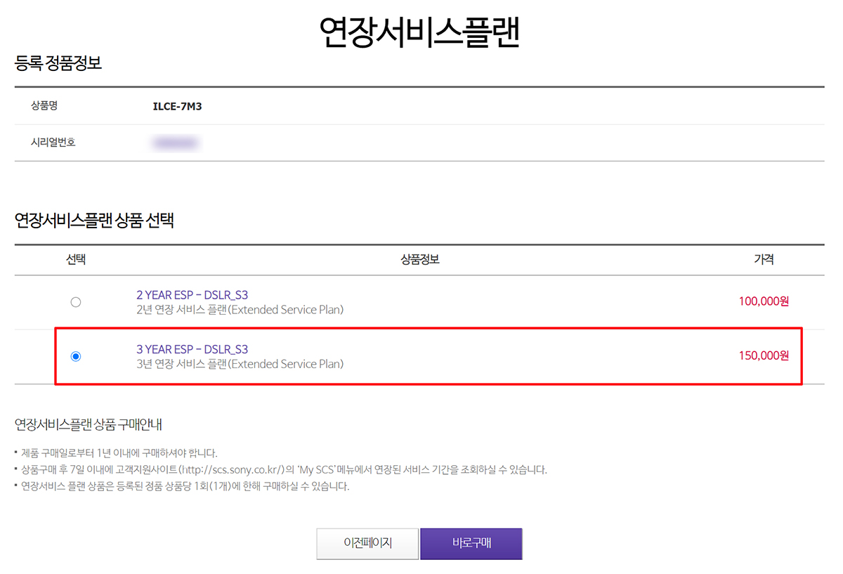 아까 위의 화면에서 '구매신청' 버튼을 클릭하면, 이렇게 구입할 수 있는 연장서비스 플랜이 나오게 되는데요. 보증 연장기간에 따라 2년짜리와 3년짜리가 있습니다. 2년 짜리는 10만원이고요. 3년 짜리는 15만원이예요. 여기서 기존 보증기간에 더해 2년 혹은 3년을 추가한다는 것이 아니고, 기존 보증기간인 1년을 포함한 기간이니 착각을 하지 않도록 주의하시길 바랍니다. 저의 경우 3년 짜리를 구매했는데, 2019년 7월에 A7m3를 구입을 한 것이니, 기존 1년 보증기간을 포함해 2022년 7월까지 서비스가 된다는 것입니다.