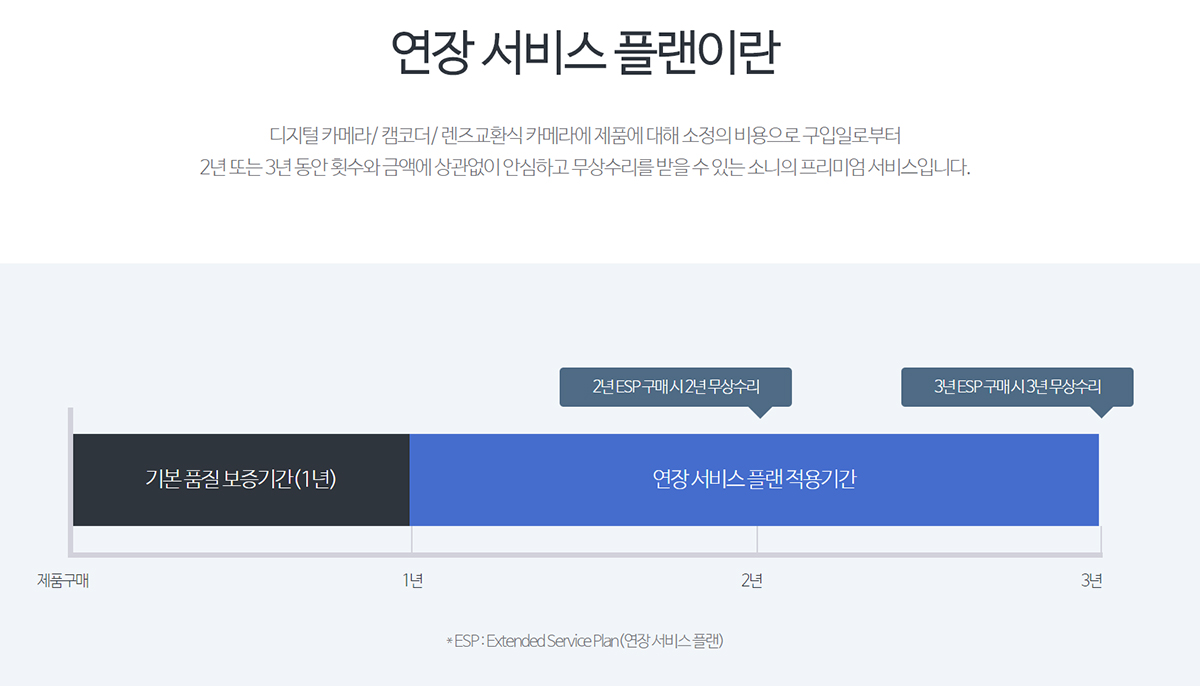 보통 대부분의 전자제품이 그러하듯이 카메라의 경우에도 처음 신제품을 구입하게 되면, 각 사의 홈페이지를 통해 정품등록을 하게 되고, 그 시점 이후로 1년 동안 무상보증 서비스를 받을 수 있지만, 1년이 지나면 보증기간이 사라지게 됩니다. 캐논의 경우에는 자체 이벤트를 통해 2년까지 가능하긴 하지만, 대부분 1년이 지나면 끝인데, 소니의 경우에는 1년 AS 무상보증기간이 지나기 전, ESP라 불리는 연장서비스 플랜에 가입을 하게 되면, 최대 2년 더 AS 기간을 연장할 수 있다고 합니다.