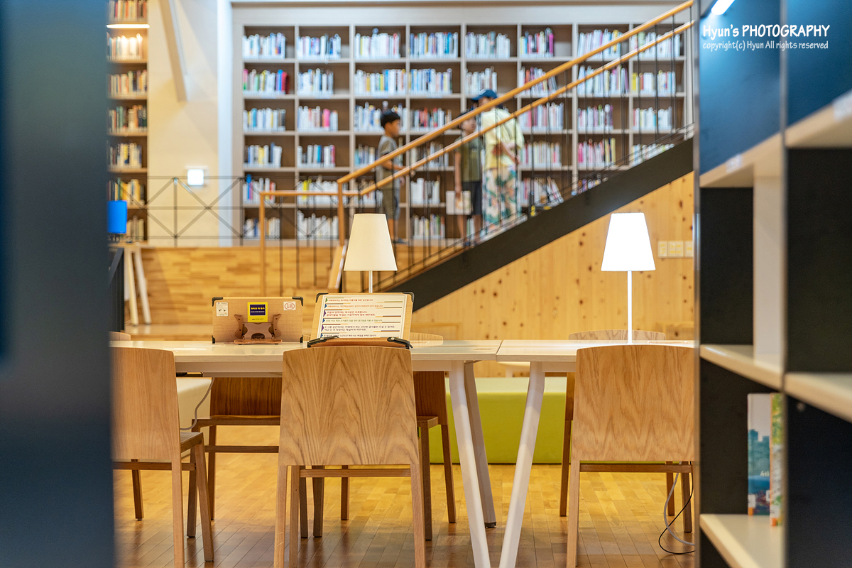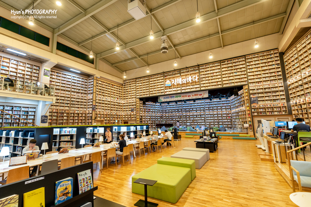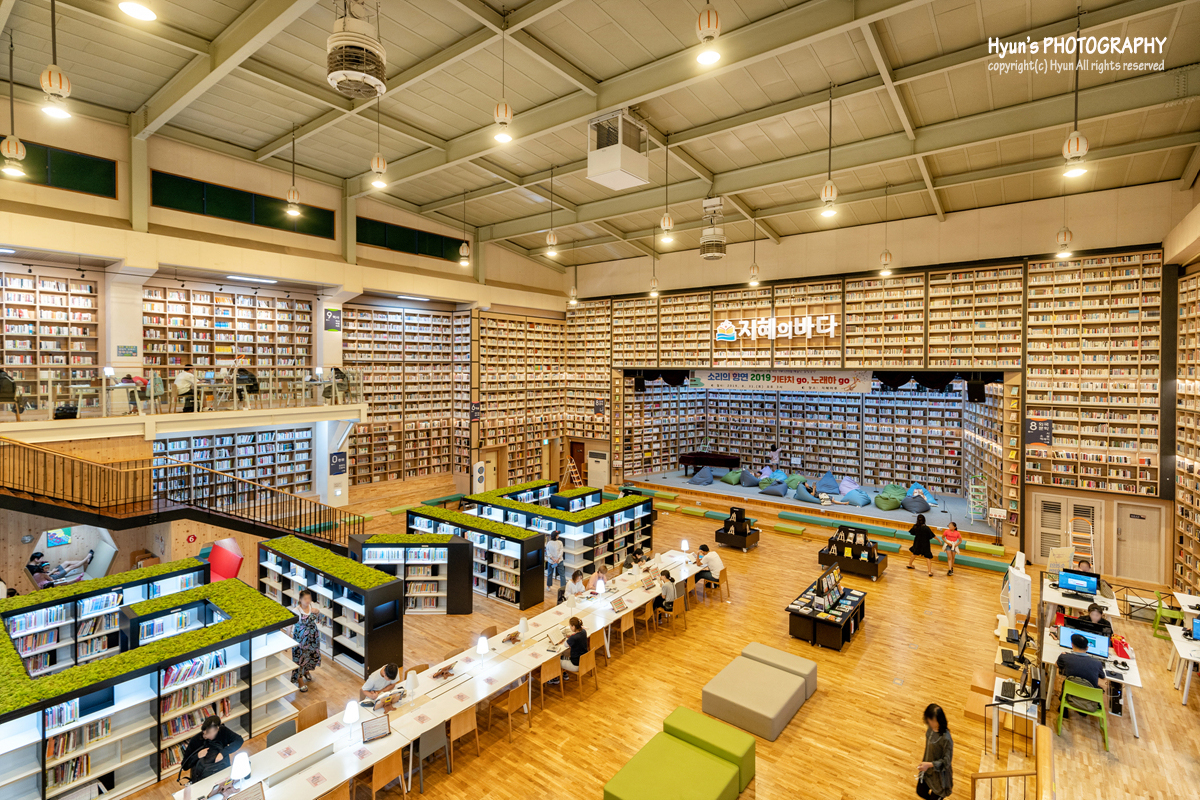 창원에 위치한 지혜의 바다 도서관은 폐교가 된 중학교 체육관을 리모델링 해서 만든 도서관이라고 하는데요. 체육관 공간이 워낙 넓어서 그런지 장서 규모도 생각보다 많은 편이고, 또한 최근에 만들어진 곳이라 그런지 도서관 내부 인테리어도 매우 깔끔하고 쾌적한 곳이었습니다.
