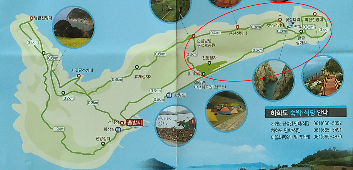 하화도 꽃섬길 트레킹 코스는 위와 같습니다. 출발지가 있는 곳이 바로 선착장 부근입니다. 안내표지에는 선착장~낭끝전망대~시짓골 전망대~휴게정자2~순넘밭넘 구절초 공원~큰산전망대~깻넘전망대~큰굴삼거리~막산전망대~꽃섬다리~애림민 야생화 공원~선착장 코스로 모두 6km 정도의 3시간 코스로 소개가 되어 있는데요. 저는 모든 코스를 다 걷지는 못하고, 오른쪽 동그라미 원에 표시되어 있는 코스로 반쪽 코스만 걸었습니다.