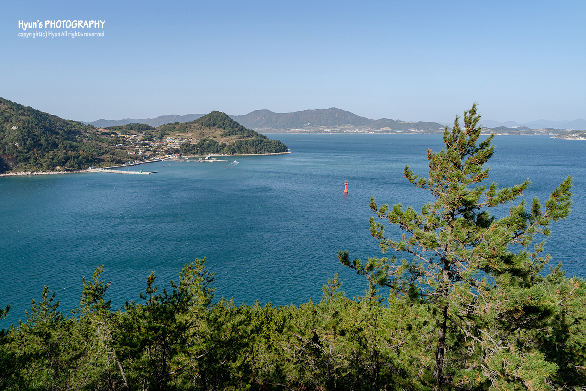 꽃섬다리를 건너게 되면, 하화도 끝 쪽에 위치한 작은 섬 장구도를 내려다 볼 수 있는 막산전망대가 나오게 되고요. 쪽빛 여수 바다가 시원하게 펼쳐져 있는 풍경을 바라볼 수 있게 됩니다. 이곳부터는 이제 큰굴삼거리를 지나 다시 선착장 쪽으로 되돌아 가는 길을 선택할 수 있어요.