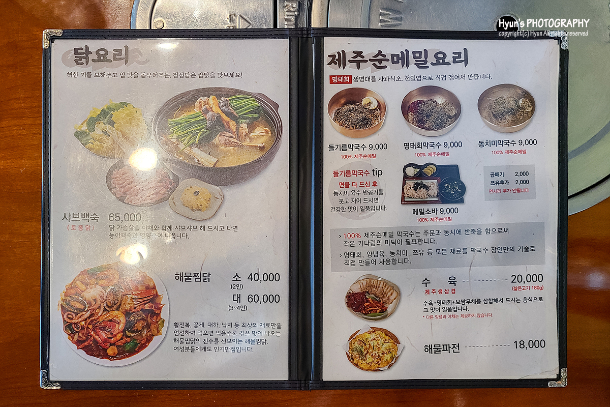 메뉴판을 펼치면 닭요리와 함께 제주 순메밀 요리인 막국수 3종류가 나와 있습니다. 주 메뉴가 막국수 집이기 때문에 닭요리 보다는 막국수 위주로 주문을 해서 먹는 것을 추천하는데요. 막국수는 다시 들기름 막국수, 명태회 막국수, 동치미 막국수 세 가지로 나뉘어 있습니다. 가격은 모두 동일하게 9000원이고요. 셋 다 맛있다고는 하지만, 만약 여름이라면 시원한 동치미 막국수를 추천드리고, 다른 계절에는 고소한 들기름 막국수나 명태회 막국수도 괜찮을 것 같습니다.
