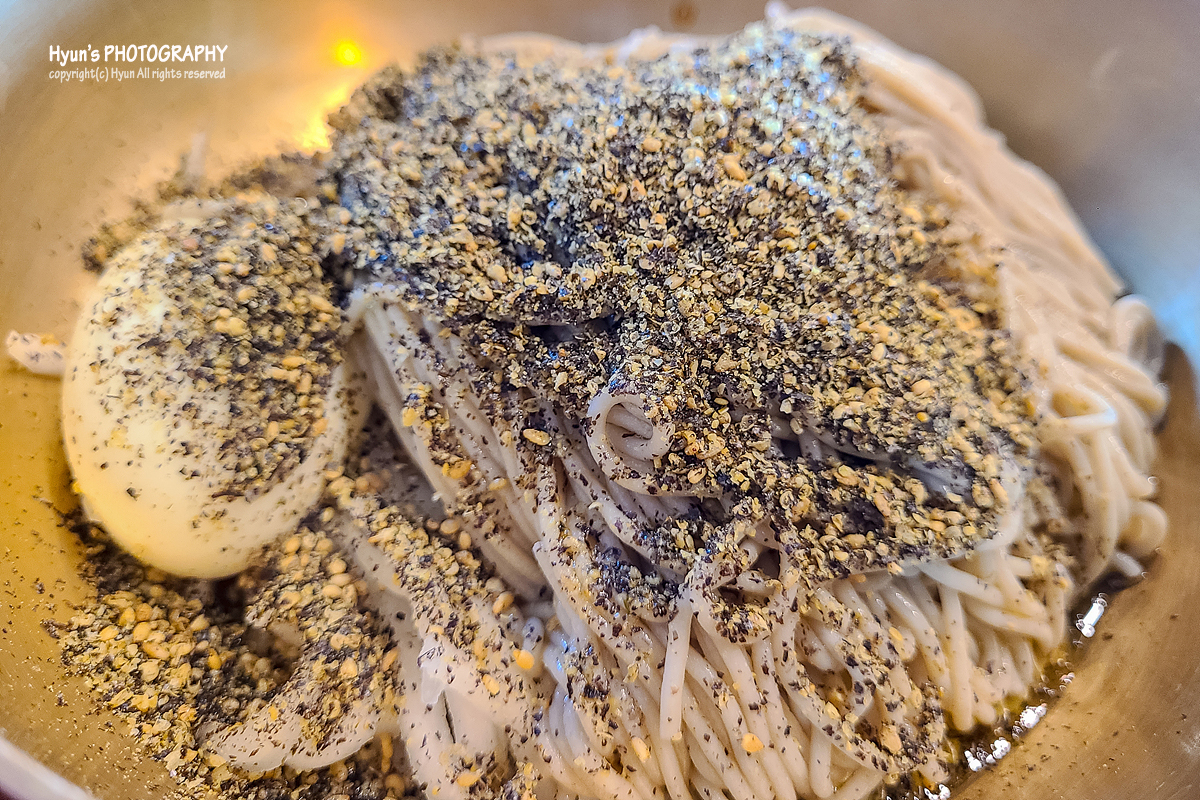 저는 들기름 막국수를 주문해서 먹었습니다. 100% 제주에서 생산되는 순메밀을 반죽해서 만들기에 꽤 자부심을 갖고 있는 식당이었어요. 오랜 기다림 끝에 나온 들기름 막국수인데, 보기만 해도 고소함이 풍겨 오는 것 같았습니다. 밑반찬은 김치가 함께 나오고 따로 작은 그릇에 동치미 국물이 나오기도 하는데, 동치미 국물은 막국수를 다 먹어갈 때 말아서 먹으면 맛있다고 합니다.