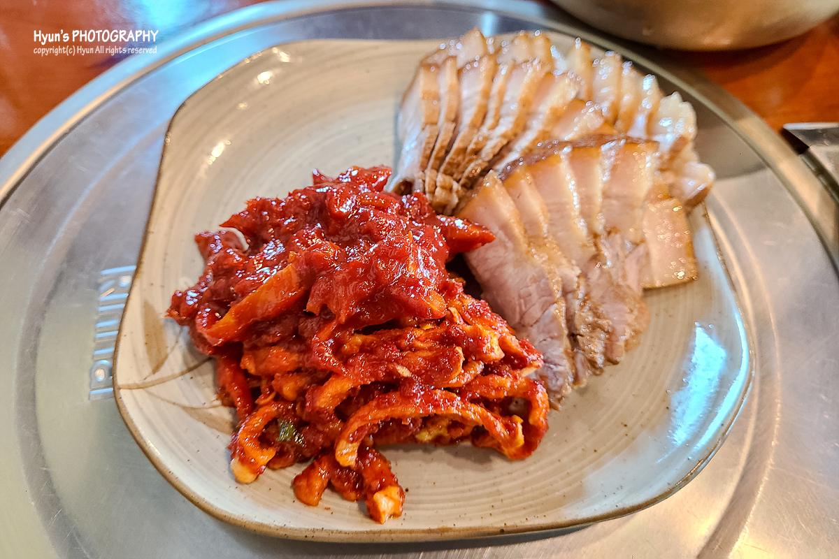 한창 허기가 질 때에는 막국수 하나만 먹기에는 좀 허전할 수도 있기 때문에 사이드 메뉴로 수육 한 접시도 같이 주문했습니다. 수육에는 명태회랑 보쌈무채가 같이 나오기도 해서 명태회 막국수를 간접적으로나마 맛볼 수 있기도 합니다. 들기름 막국수의 맛은 양념간이 약해서 마치 평양냉면 같은 슴슴한 맛기는 하지만, 고소한 풍미와 수육 및 명태회랑 같이 먹으면 꽤 잘 어울리는 맛이 나더군요.