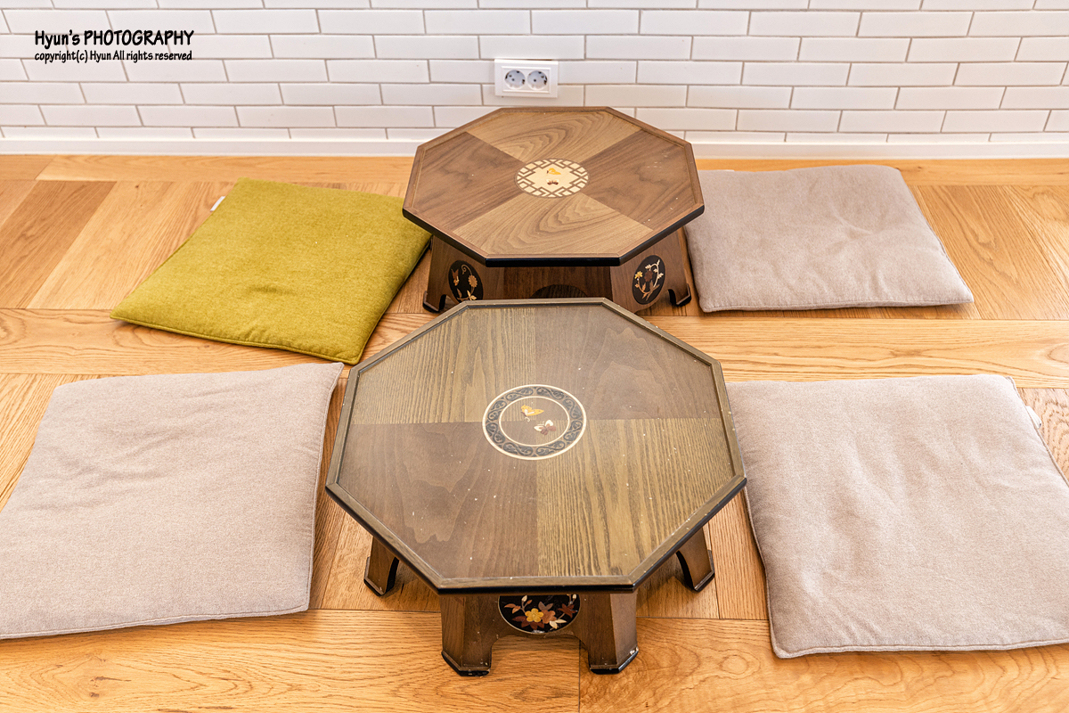 좌식 테이블은 모두 3팀이 앉을 수 있는 자리가 마련되어 있고, 각 자리에는 소박한 소반과 푹신한 방석, 그리고 각 공간을 구분할 수 있는 발이 쳐져 있는 것이 특징이더라고요. 특히 바닥 난방도 온돌처럼 뜨끈하게 잘 되어 추운 겨울철에 특히 인기가 많은 자리라고 합니다.