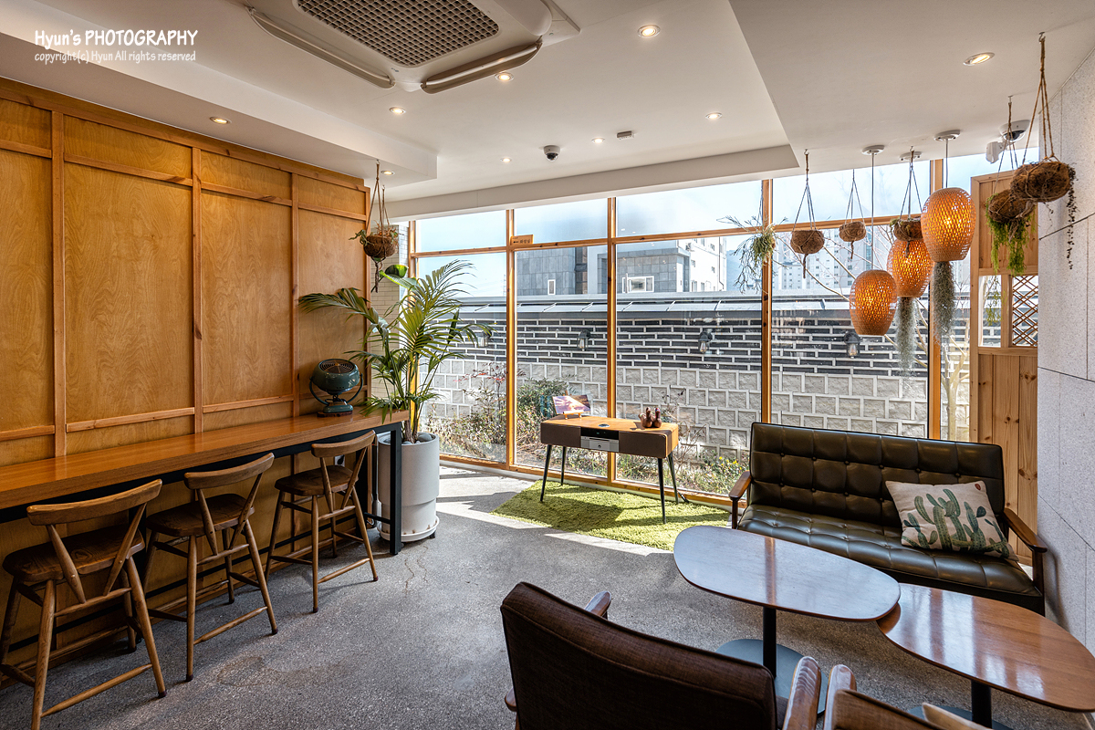 좌식 테이블 자리도 좋았지만, 입식 테이블 있는 공간 역시 모두 나무로 되어 있는 테이블과 의자를 사용해서인지 아늑하고 따뜻한 느낌이 듭니다. 입식 테이블 공간 역시 마찬가지로 테이블 사이사이마다 발이 쳐져 있는 모습이고, 1층에 위치한 카페이긴 하지만, 삼면이 통유리로 되어 있어서인지 채광이 너무 좋아 따스한 봄햇살을 즐기기에 충분한 곳이었습니다.