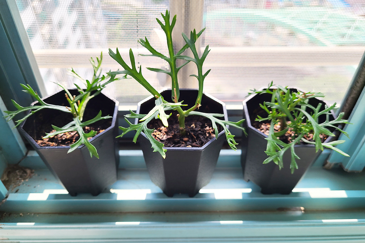 뿌리내림을 확인하고 물로 살살 씻겨내니 어떤 것은 뿌리가 많이 자란 것도 있고, 또 어떤 것은 이제 막 뿌리를 내기 시작한 것도 있더군요. 일단 아직 뿌리를 더 내려야 하는 가지들은 다시 녹소토에 넣어주고, 실한 뿌리를 내린 가지는 우선 포트묘에 가식을 해주기로 합니다. 가식은 화분에 정식을 해주기 전, 뿌리를 조금 더 활착시키고 실제 자랄 환경에 적응하는 단계를 말하는데요.