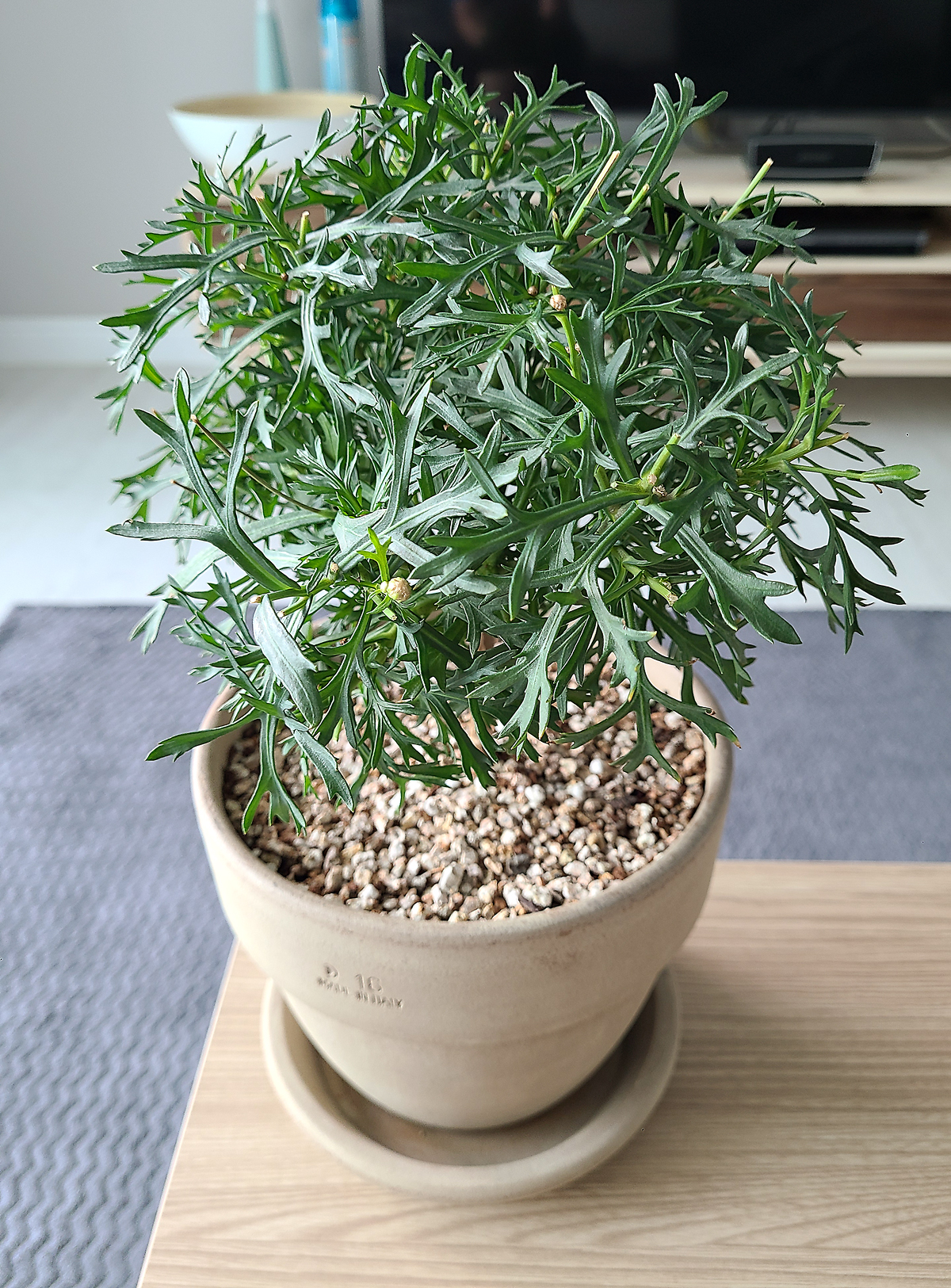 봄이 지나 이제 더운 여름이 되고 나니 서서히 꽃대를 올리는 개수가 줄어들더니 어느새 꽃들은 모두 사라지고 그냥 초록 쑥갓 풀이 되어버렸습니다. 목마가렛 잎은 마치 쑥갓을 닮은 모양이라 꽃이 없을 땐 볼품이 없는 편이예요. 그래서 더운 여름철에 꽃이 모두 지고 나면 전체적으로 가지치기를 해주면 딱 좋은 시기입니다.