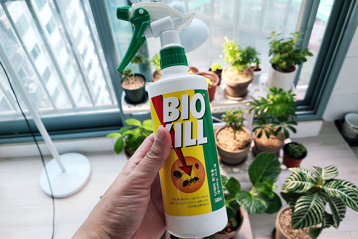 저는 처음에 목초액으로 예방을 해볼까 해서 주기적으로 목초액 희석한 물을 잎과 흙에 뿌려주곤 했었는데, 결국 뿌리파리는 생기더라고요. 그래서 비오킬을 사용해 보기도 했습니다. 비오킬은 에프킬라와 마찬가지로 성충을 죽이는 데에는 효과가 있지만, 흙 속의 알이나 유충을 박멸하는데에는 한계가 있더군요. 최후의 수단은 '빅카드'라는 농약이 있지만, 일단 빅카드는 말 그대로 농약이기 때문에 실내 베란다에서는 도저히 안될 때 정말 최후의 수단으로만 남겨 놓을 생각이었습니다.