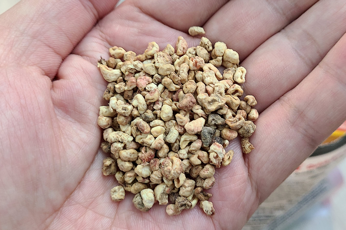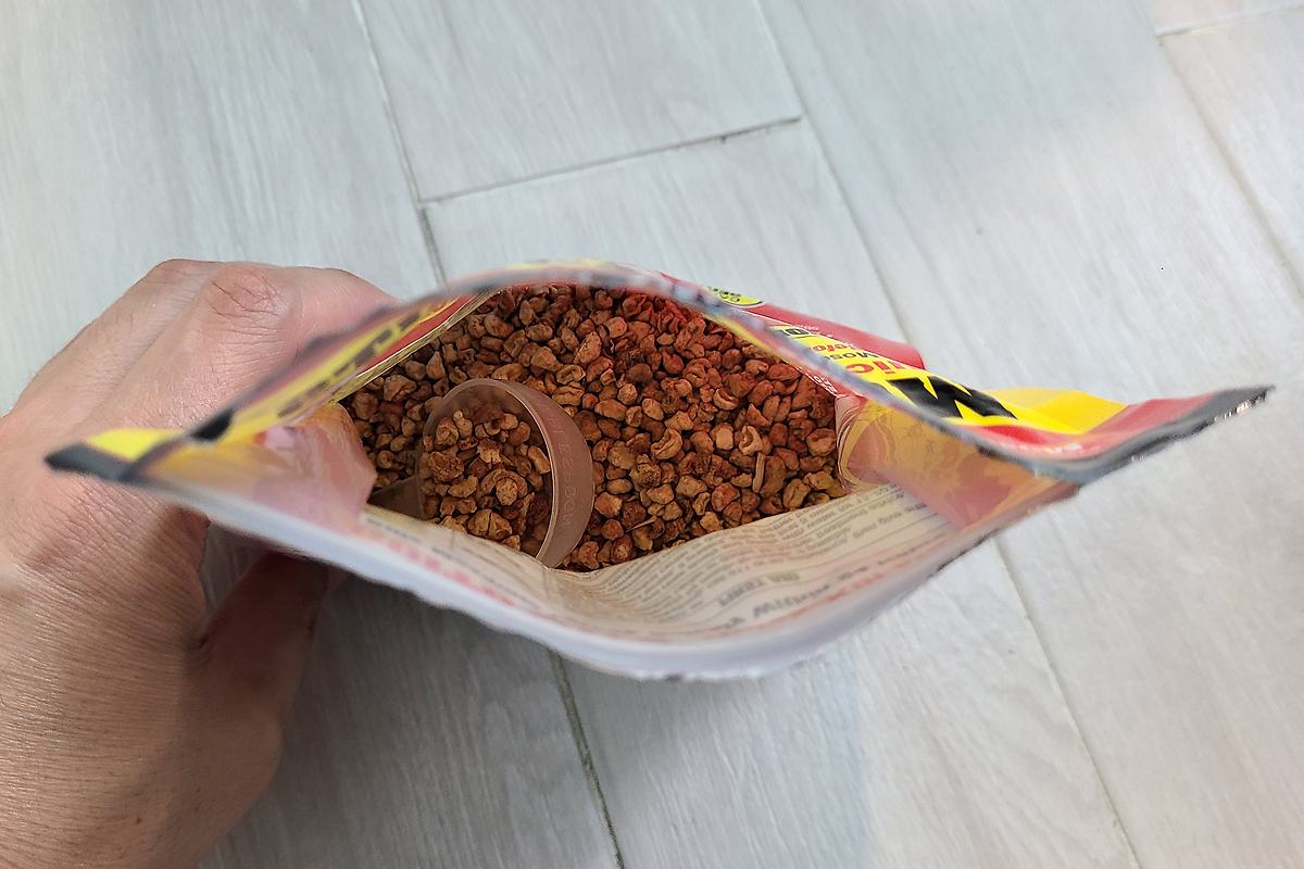 마치 녹소토나 마사토 같이 작은 알갱이 형태로 되어 있는데, 사용 방법은 이 모스키토 바이츠 알갱이들을 화분 위에 적당량을 얹어두고 물을 줄 때마다 알갱이 성분들이 녹아 흙 속으로 유입되어 뿌리파리 알이나 유충들을 박멸하는 원리인데, 저는 흙 위에 얹어두는 방법 대신 위와 같이 다시백에다가 계량스푼 한스푼 정도의 양을 담아 물조리개에 넣어 녹인 다음 그 물을 관수해 주는 방식으로 사용하고 있습니다. 대략 1리터 물에 계량스푼 1스푼 정도면 된다고 합니다.