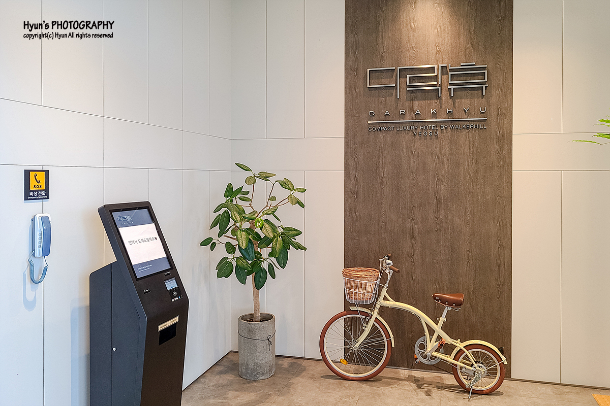 여수 다락휴 캡슐호텔 입구입니다. 고급호텔 못지 않은 굉장히 깔끔한 모습이었고요. 입구 한쪽에는 코로나 시대 비대면 셀프체크인 기계가 있긴 했는데, 최근에는 다시 대면 셀프인으로 진행하는 것 같았습니다. 그리고 물품보관함도 준비가 되어 있어 여행 도중 짐을 맡길 일이 있으면 편하게 이용할 수 있습니다.