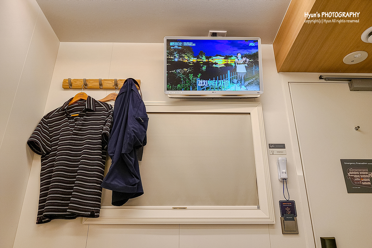 TV는 한쪽 벽면 창문 윗쪽에 설치되어 있어 침대에 누우면 바로 볼 수 있는 구조이고, 창문은 복도 쪽으로 나 있어서 블라인드는 항상 내려놓는 것이 좋을 것 같았습니다. 화장대 아래쪽에는 슬리퍼 2개와 휴지통, 소화기까지 구비되어 있고요. 커다란 짐이나 캐리어가 있다면, 침대 밑 보관할 수 있는 넓은 공간이 있어 거기에 보관하시면 됩니다.