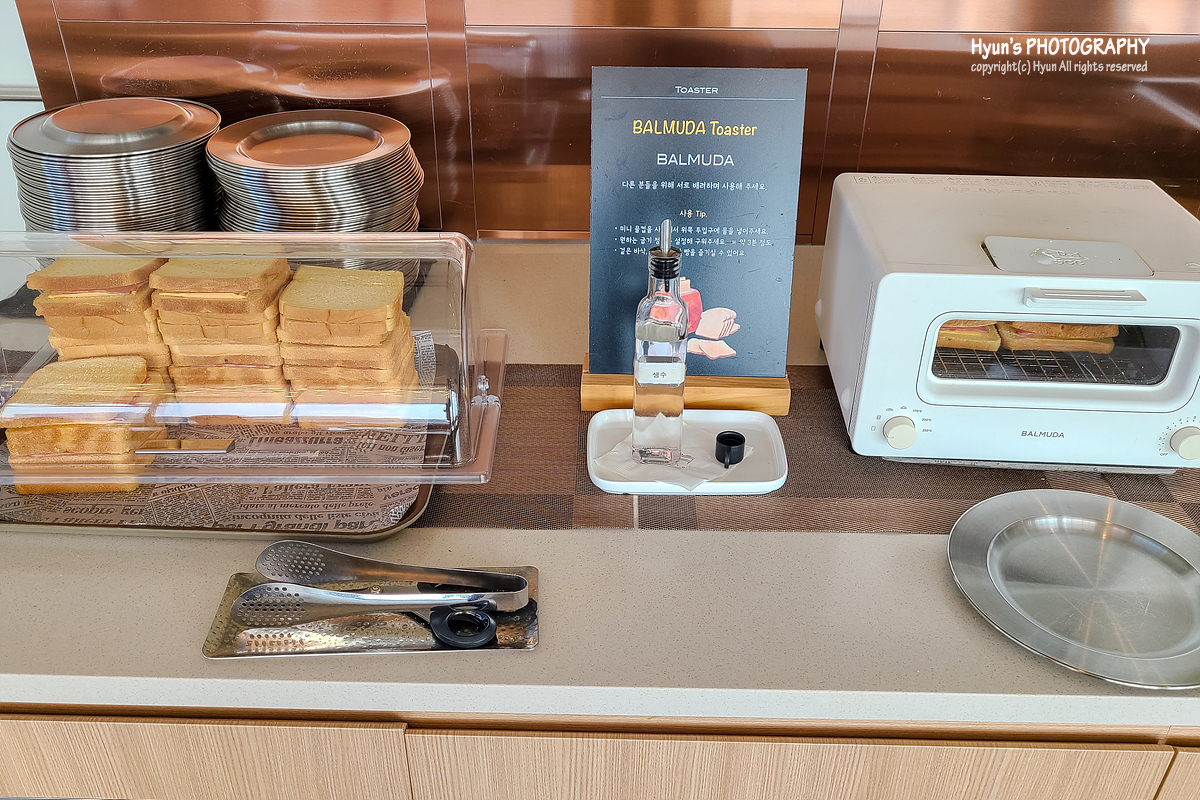 한쪽 주방 같은 곳엔 커피머신과 정수기가 있어 숙박객은 언제든 이용 가능하고요. 다음날 아침 조식도 이곳에서 드시면 됩니다. 조식 메뉴는 토스트에 시리얼의 아주 평범한(?) 구성으로 되어 있어요. 그래도 토스트기는 발뮤다 토스트기여서 빵맛은 나름 괜찮았습니다.