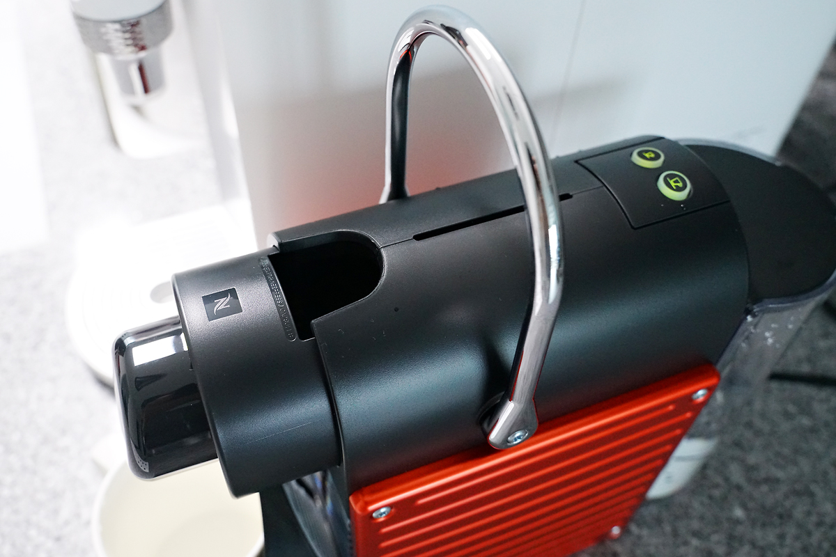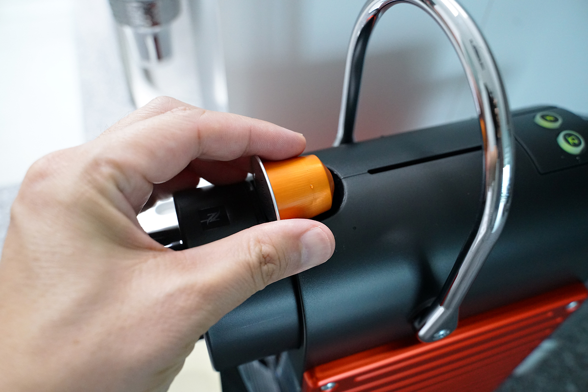 세척을 마치고 나면, 이제 캡슐을 넣고 커피를 내려먹을 수 있게 되는데요. 머신의 손자이를 들어 올리면 캡슐이 들어가는 공간이 열리게 되고, 원하는 캡슐을 골라 넣은 뒤, 다시 손잡이 레머를 아래로 내려주면 커피를 내릴 준비가 완료됩니다. 그런 다음, 상단 버튼을 눌러 커피를 추출하면 되는데요. 큰 컵은 롱고 사이즈, 작은 컵은 에스프레소 사이즈이니 원하는 타입으로 선택해서 내려마시면 됩니다.