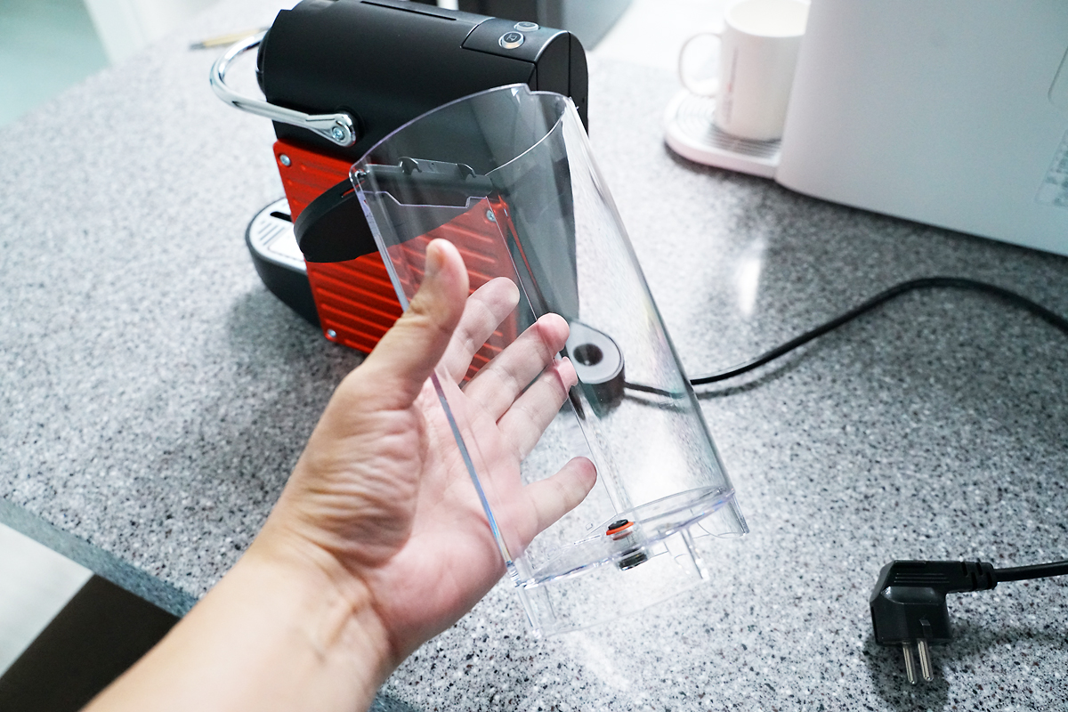 커피 머신 뒤에는 물통이 결합되어 있는 형태입니다. 물통 용량은 약 0.7L 정도이며, 한 번 채워놓으면 여러 잔 추출이 가능하지만, 저는 딱 한 컵만 마실 정도의 물만 채우고 커피를 내리면 비워 놓습니다. 쉽게 분리가 되어서 세척도 간편해요.