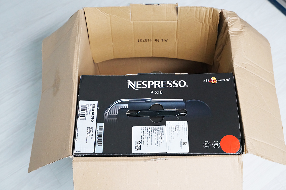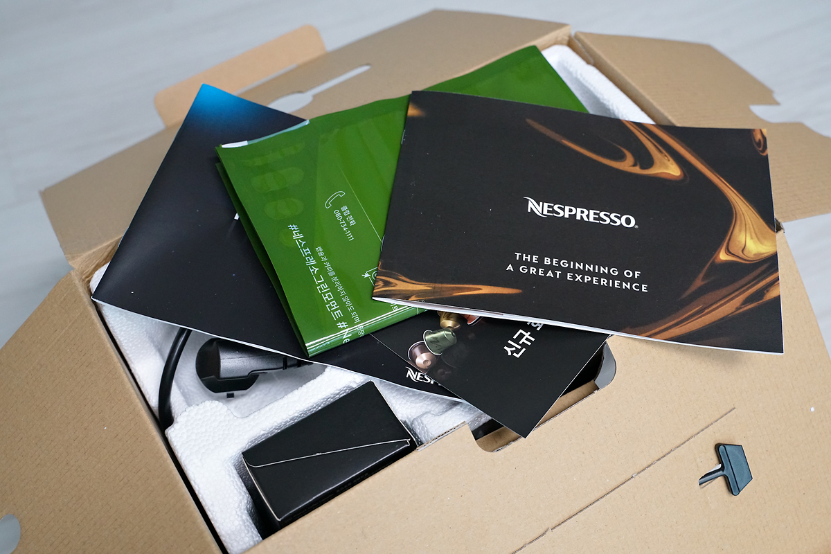 제품 박스를 열면, 네스프레소 전용 박스 포장이 한번 더 되어 있고, 그 안에는 머신 본체와 기본 제공되는 몇몇 샘플 캡슐들이 포함되어 있더라고요. 그 외에 매뉴얼 및 웰컴 오퍼 안내서, 캡슐 할인권 등이 있었고, 초록색 비닐은 나중에 쓰고 남은 커피 캡슐을 재활용하기 위한 수거봉투입니다.