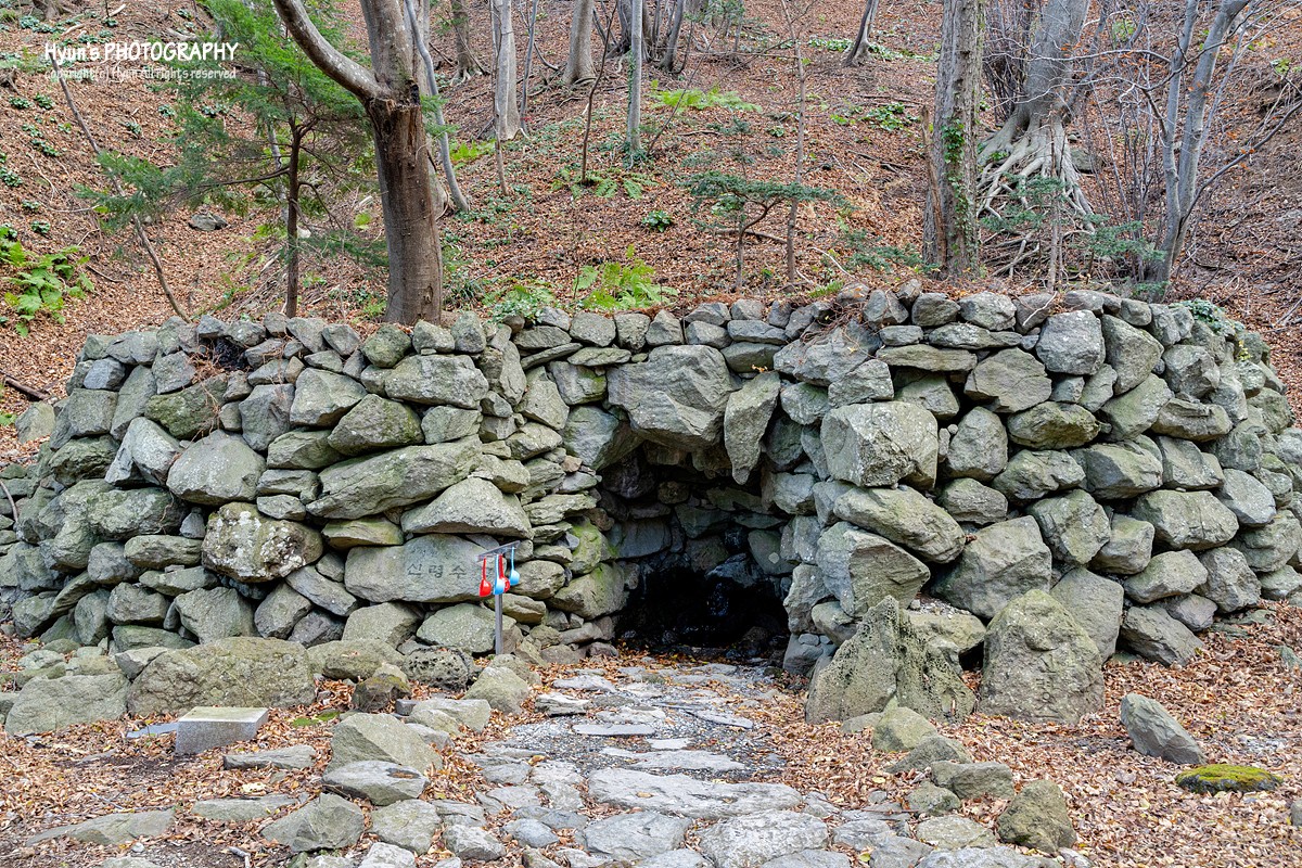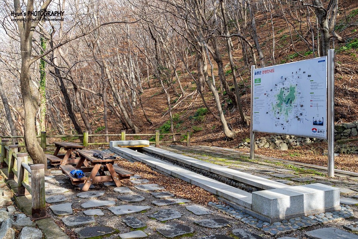 투막집을 나와 다시 둘레길을 따라 걷다 보면, 어느새 성인봉 산기슭 초입에 위치한 신령수가 있는 곳에 다다르게 됩니다. 일반 약수터처럼 생긴 신령수는 간단히 목을 축일 수 있도록 되어 있고, 한쪽에는 족욕을 할 수 있는 족욕장도 마련되어 있습니다. 겨울에는 물이 없지만, 더운 여름철에는 이곳 족욕장에 발을 담그고 있으면 피서가 따로 없을 것 같더라고요.