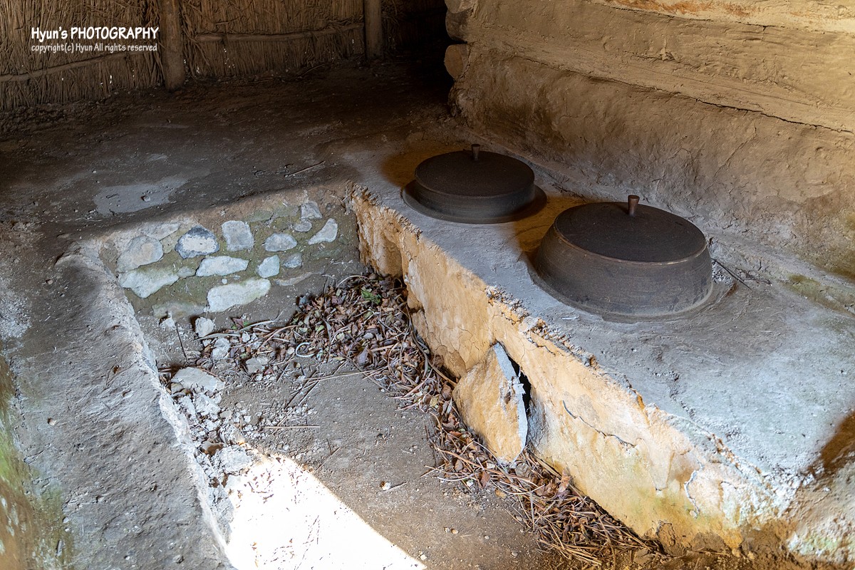 육지에서의 초가집과 비슷한 모양을 하고 있지만, 실제 안으로 들어가보면, 그 구조가 독특하다는 것을 알 수 있습니다. 투막집은 나무로 벽을 만들고 흙을 붙인 다음, 너와와 억새를 이용해 지붕을 얹은 구조라고 하는데요. 4칸이 일자형태의 구조로 이루어진 집으로 집 주위를 우데기로 둘러친 모습은 눈이 많이 내리는 울릉도 지형 특성상 눈으로부터 집 내부를 보호하기 위한 구조라고 합니다.