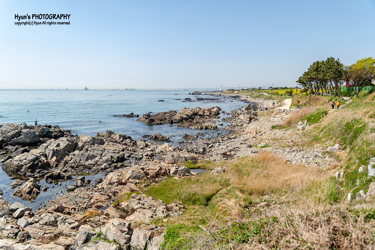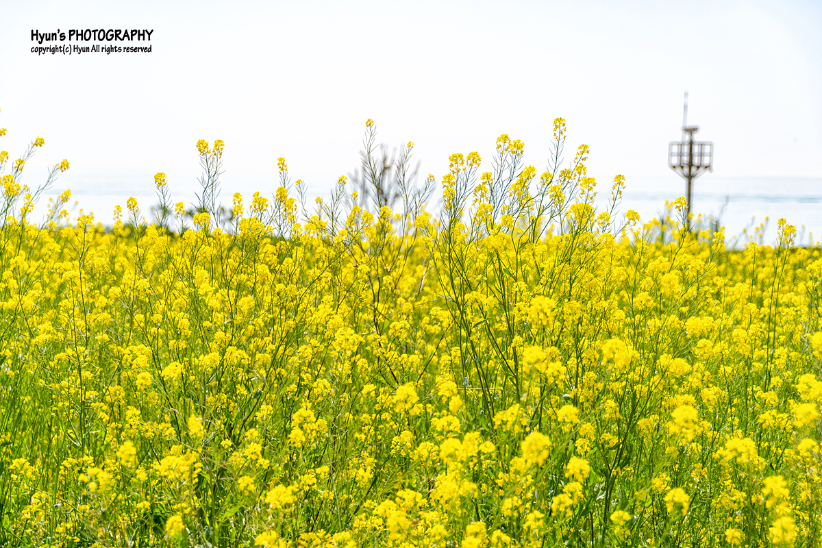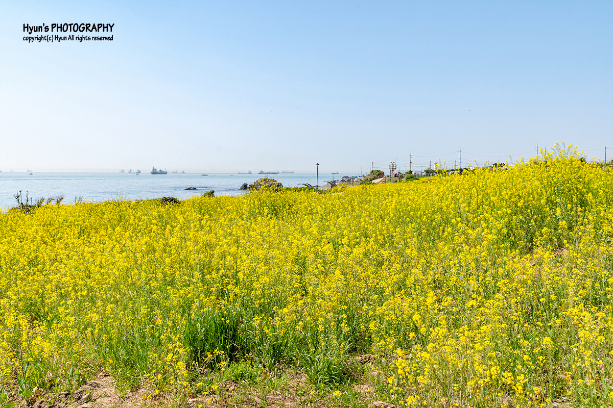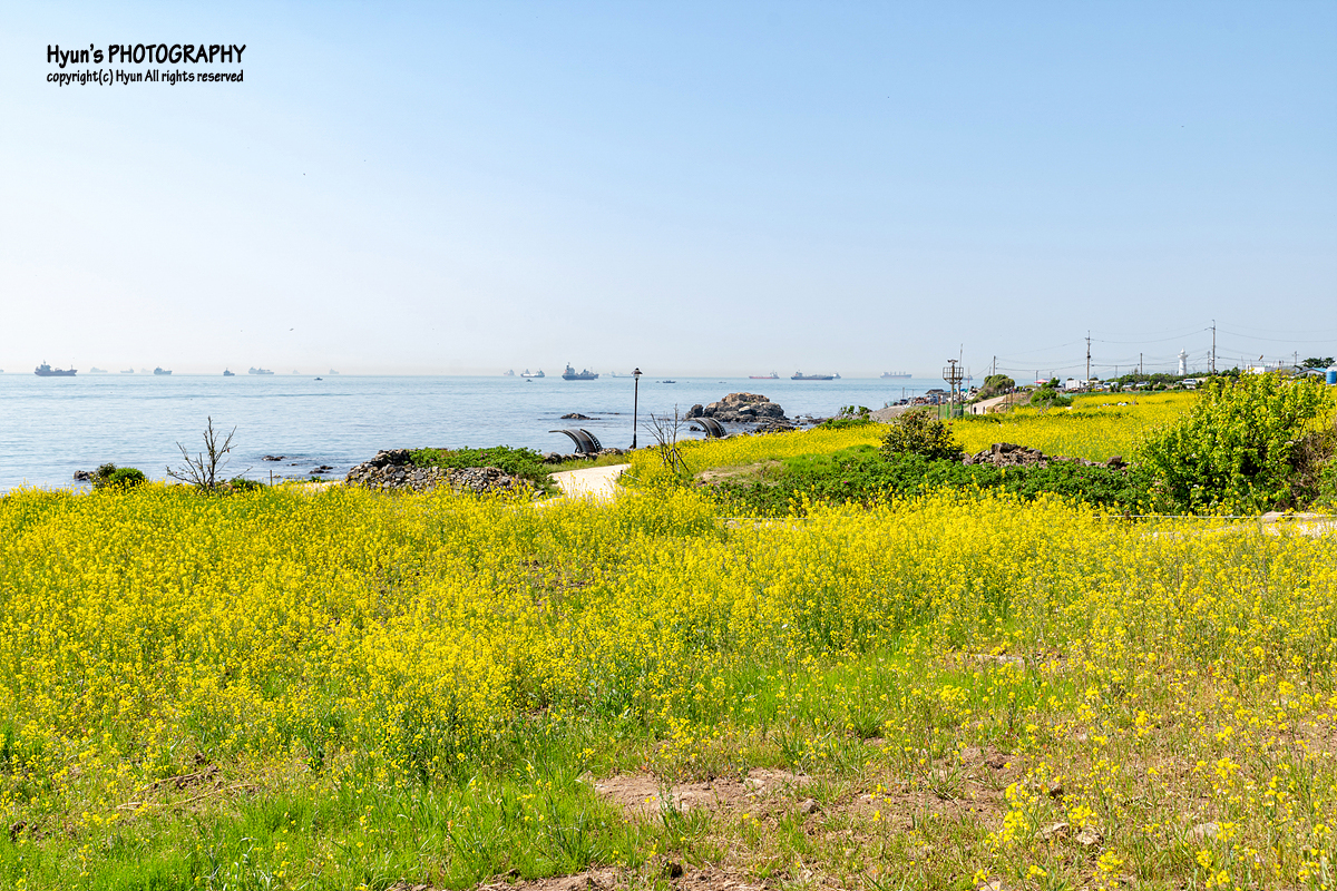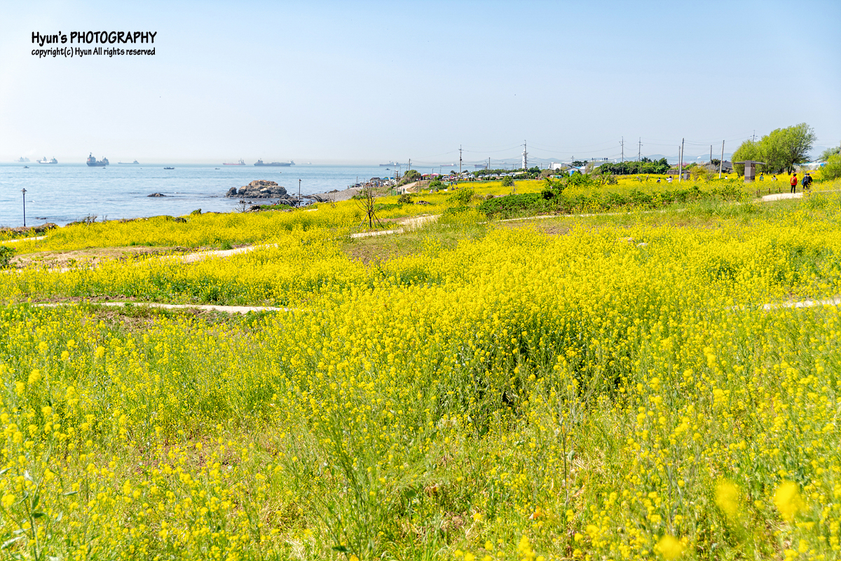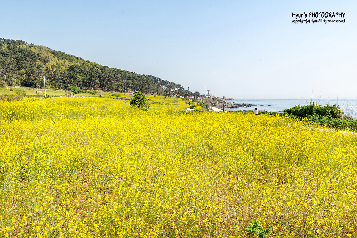 해안가 산책로 보다는 유채꽃 군락지 안쪽으로 이어지는 사잇길 쪽에서 사진을 찍는 것이 더 예쁘게 나오는 것 같더군요. 완만한 평지에 바다의 수평선과 마주하고 있는 노란 유채꽃 풍경이 마치 제주의 유채꽃 풍경을 보는 듯하기도 했습니다.