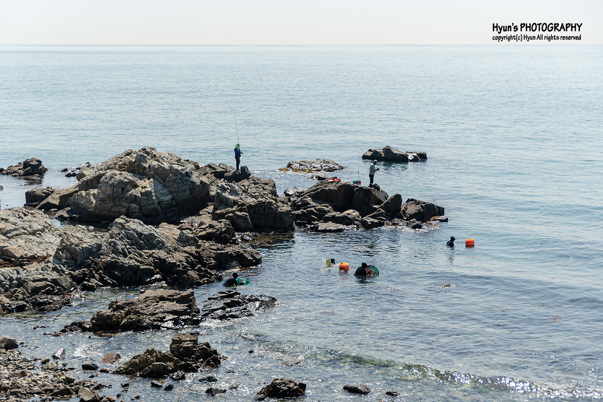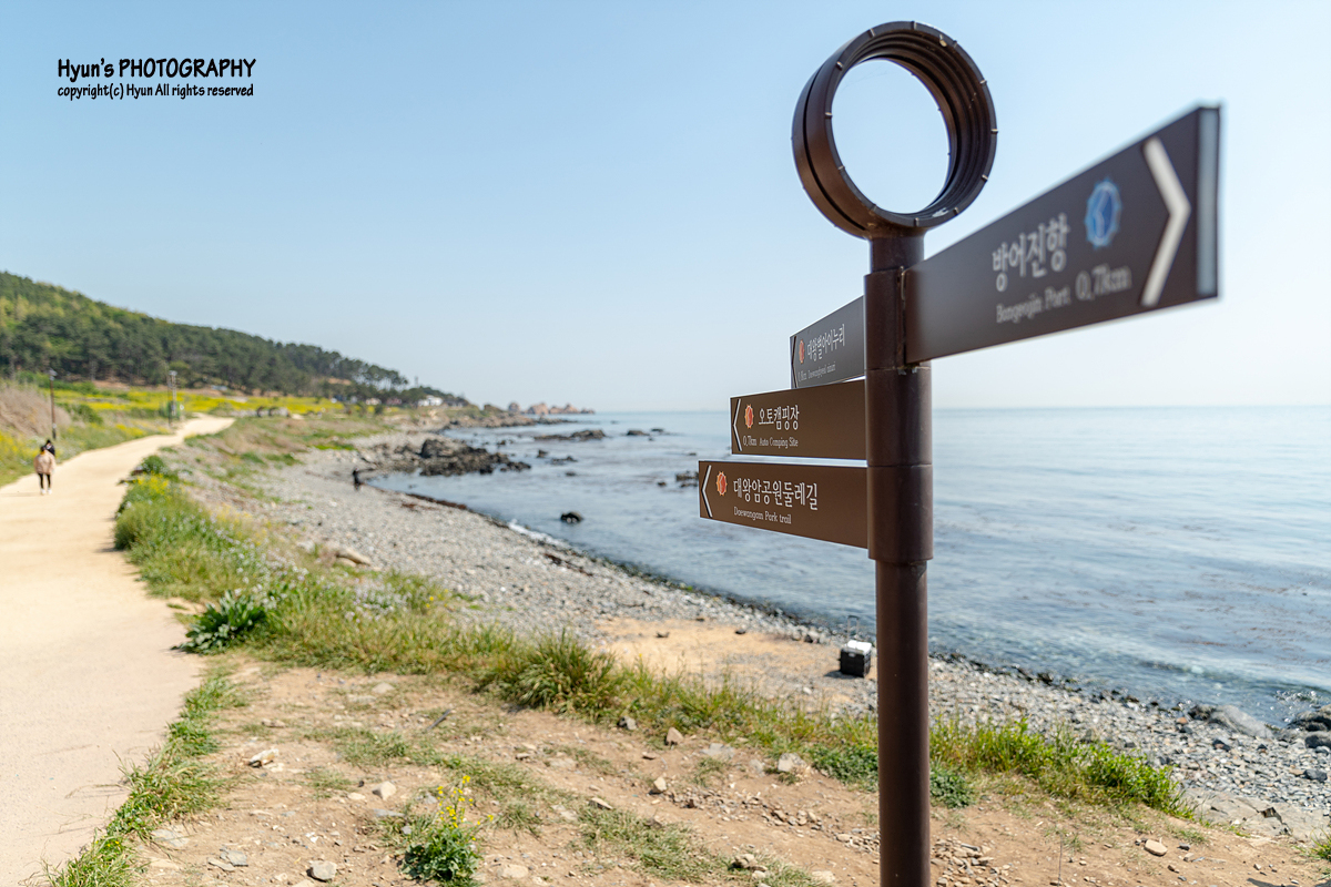 산책로 입구에서부터 유채꽃 군락지가 있는 끝까지 걸어서 가면 대략 10분 정도면 갈 수 있는 짧은 거리이지만, 그래도 그 면적이 꽤 넓게 퍼져있어 여기저기서 사진을 찍다 보면 시간 가는 줄 모르겠더라고요. 바닷가 한쪽에는 해녀분들이 열심히 물질을 하고 있는 모습도 볼 수 있었습니다. 유채꽃 군락지가 끝나는 곳에는 카라반 캠핑장이 자리잡고 있고, 계속 이어지는 산책로를 걷다 보면 대왕암공원까지 갈 수 있으니 걷기여행을 즐겨하는 분들은 대왕암 공원까지 한 번 가보는 것도 좋을 것 같습니다.